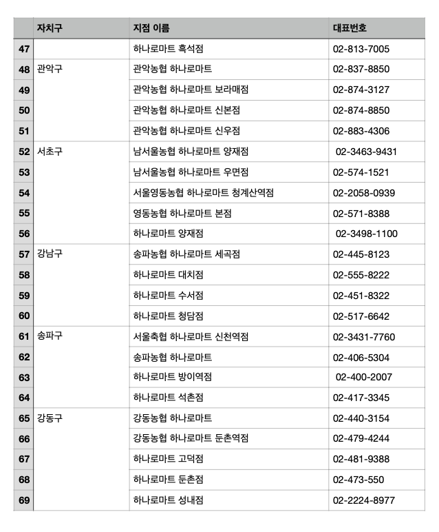 서울시의 경우는 제가 표로 만들어 놓아서, 기본적인 정보를 아래표에서 확인할 수 있습니다. 그 외의 지역은 농협 하나로마트 홈페이지에서 매장 위치를 찾을 수 있습니다.