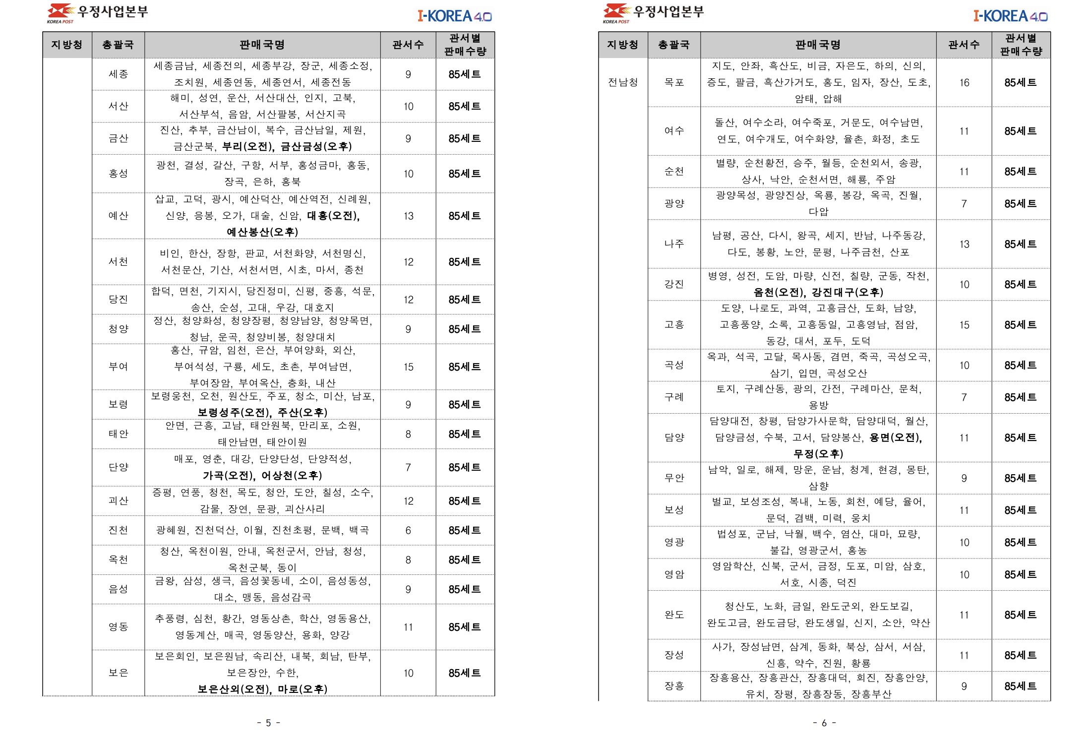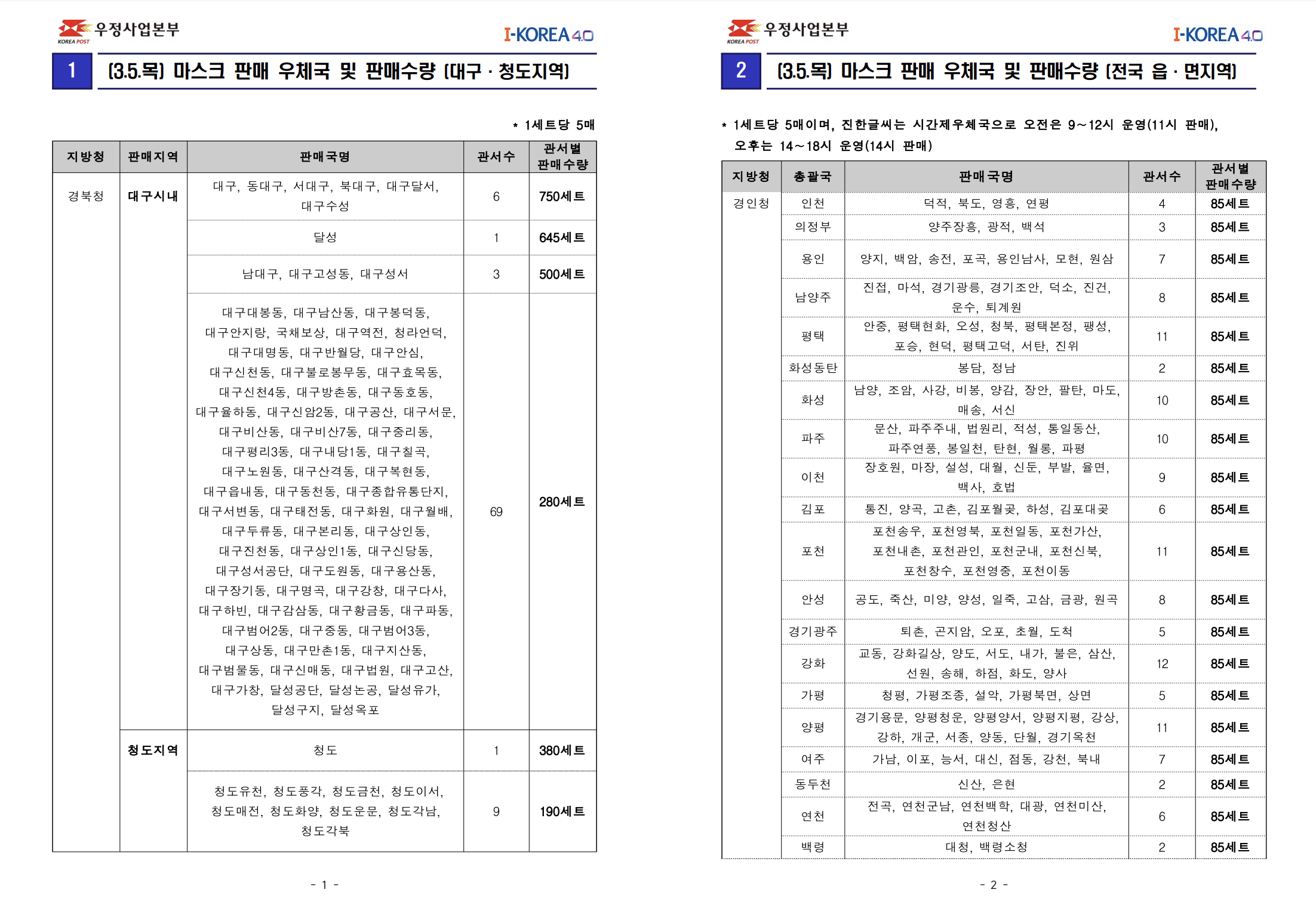 우체국에서는 제주 도서지역과, 시간우체국을 제외하고는 오전 11시부터 판매를 시작한다고 합니다. 판매 수량은 1인당 5매로 제한됩니다. 아래는 지역별 3월 5일 우체국 마스크 판매 계획입니다.