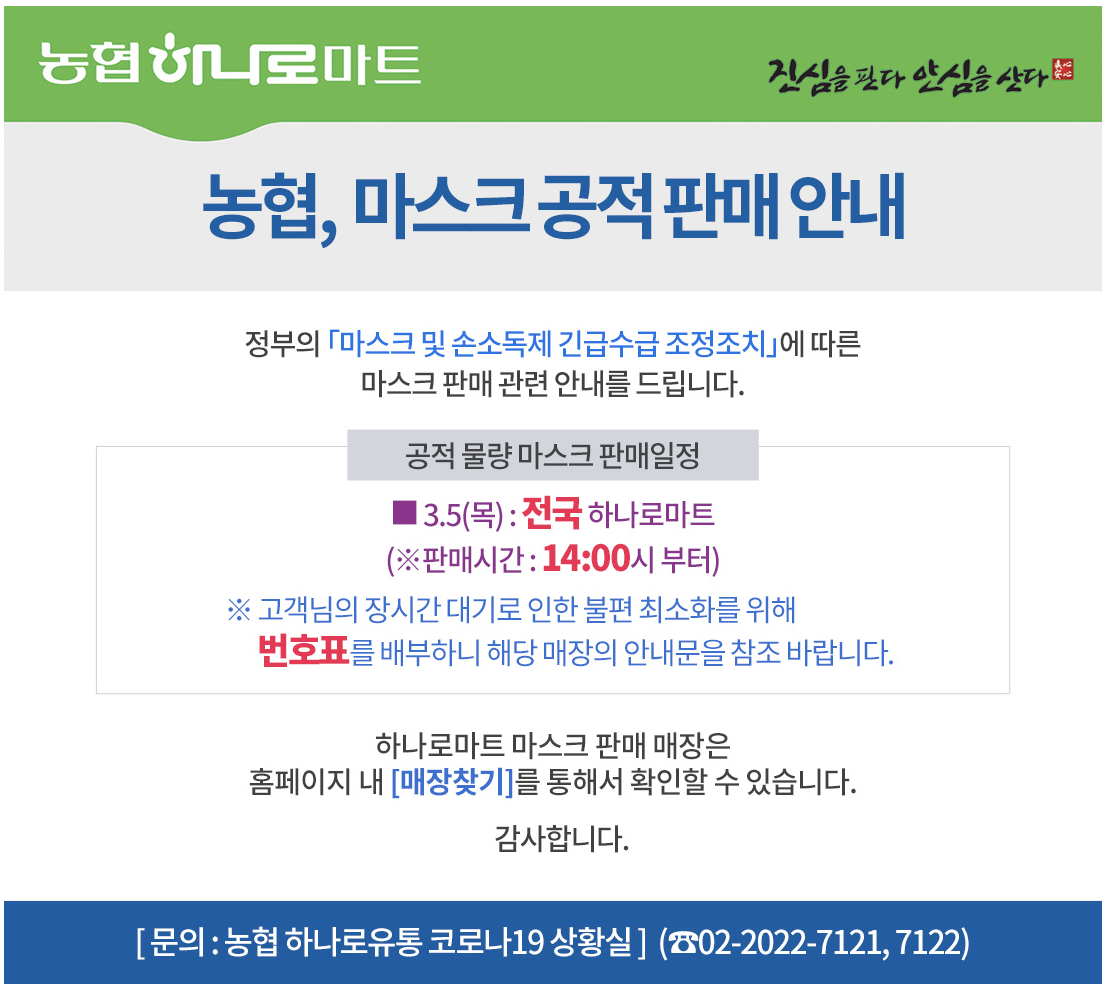 | 농협 하나로마트 공적마스크 서울시 판매처 정보 (매장리스트) (0) | 2020.03.04 |