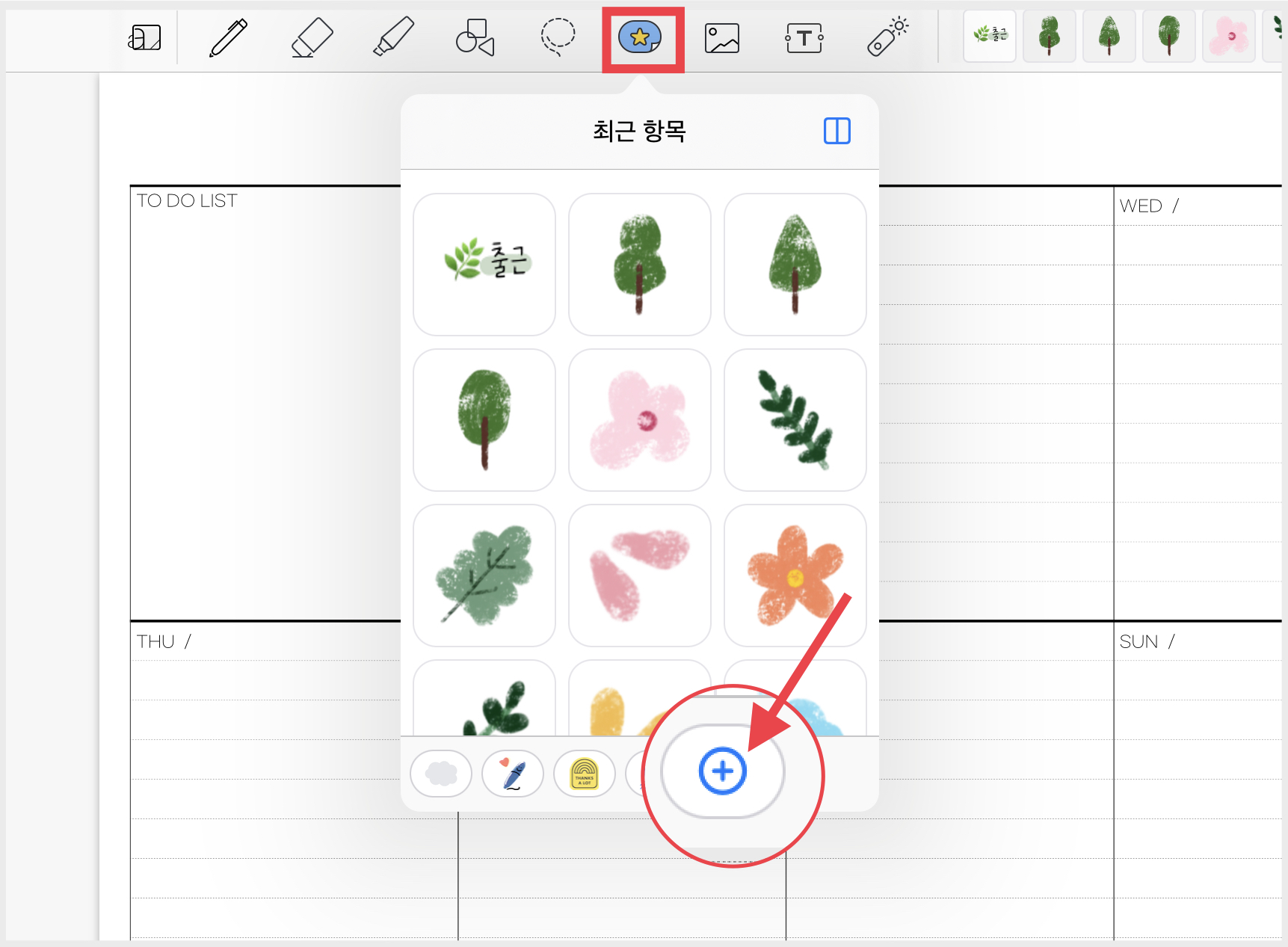 ▲ 별 모양이 그려진 스티커 메뉴를 누르고, 하단에 있는 메뉴를 오른쪽으로 넘기면 [ + ] 버튼이 나옵니다. 이걸 선택해주세요.