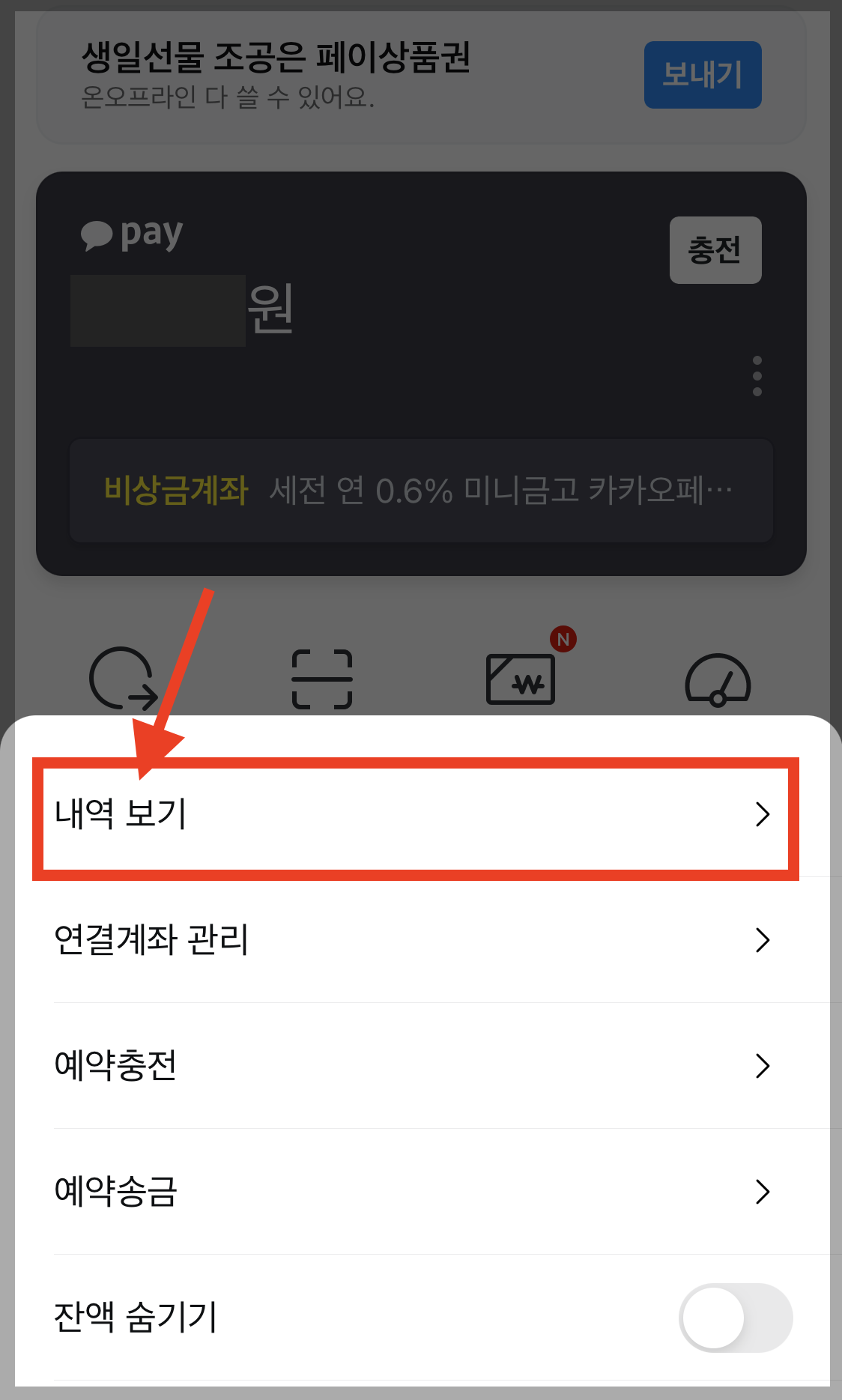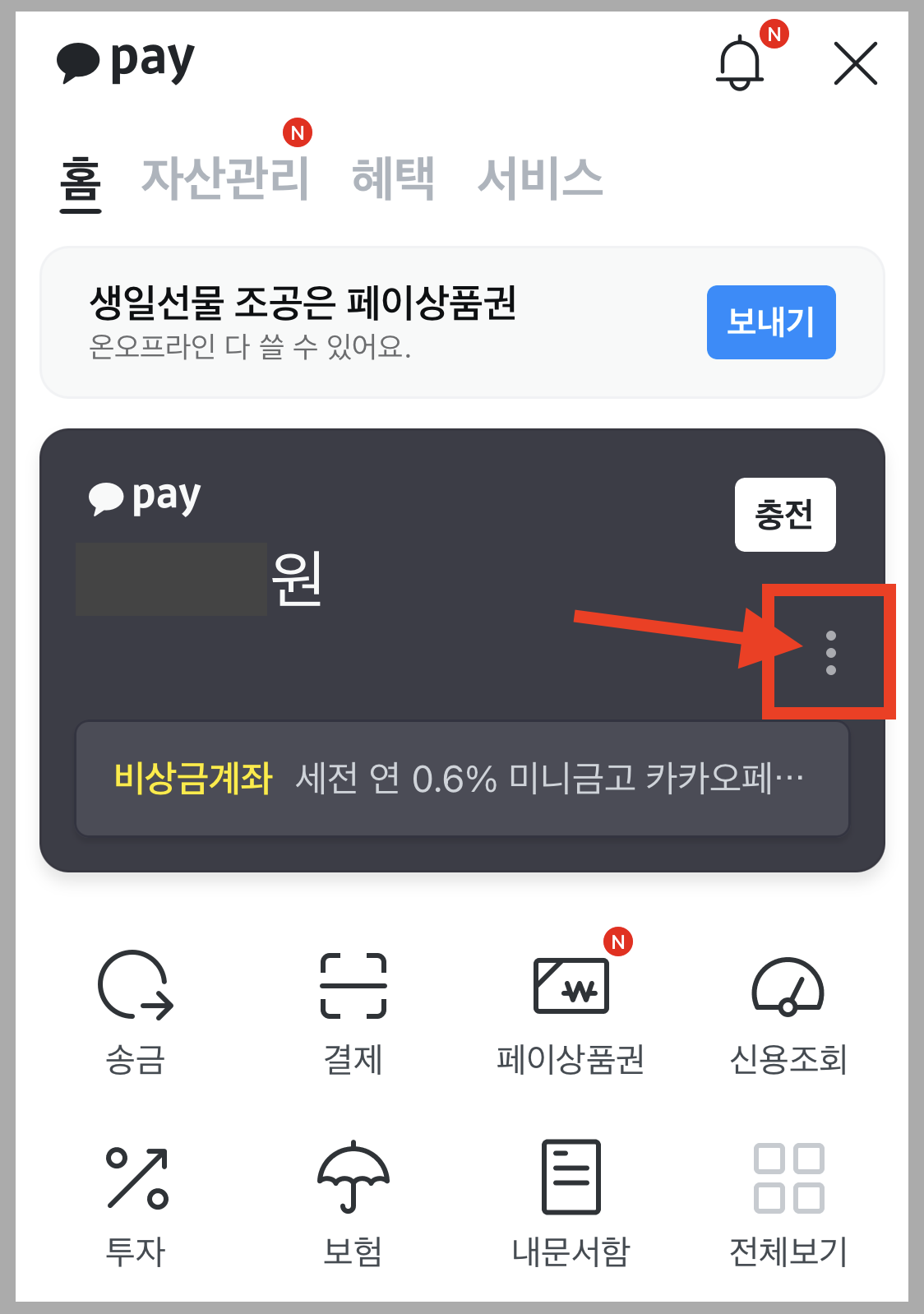 ▼ 카카오페이 메뉴가 나오면 페이 잔액이 나오고, 오른쪽에 점 세개 버튼이 또 나옵니다. 버튼을 눌러주세요.