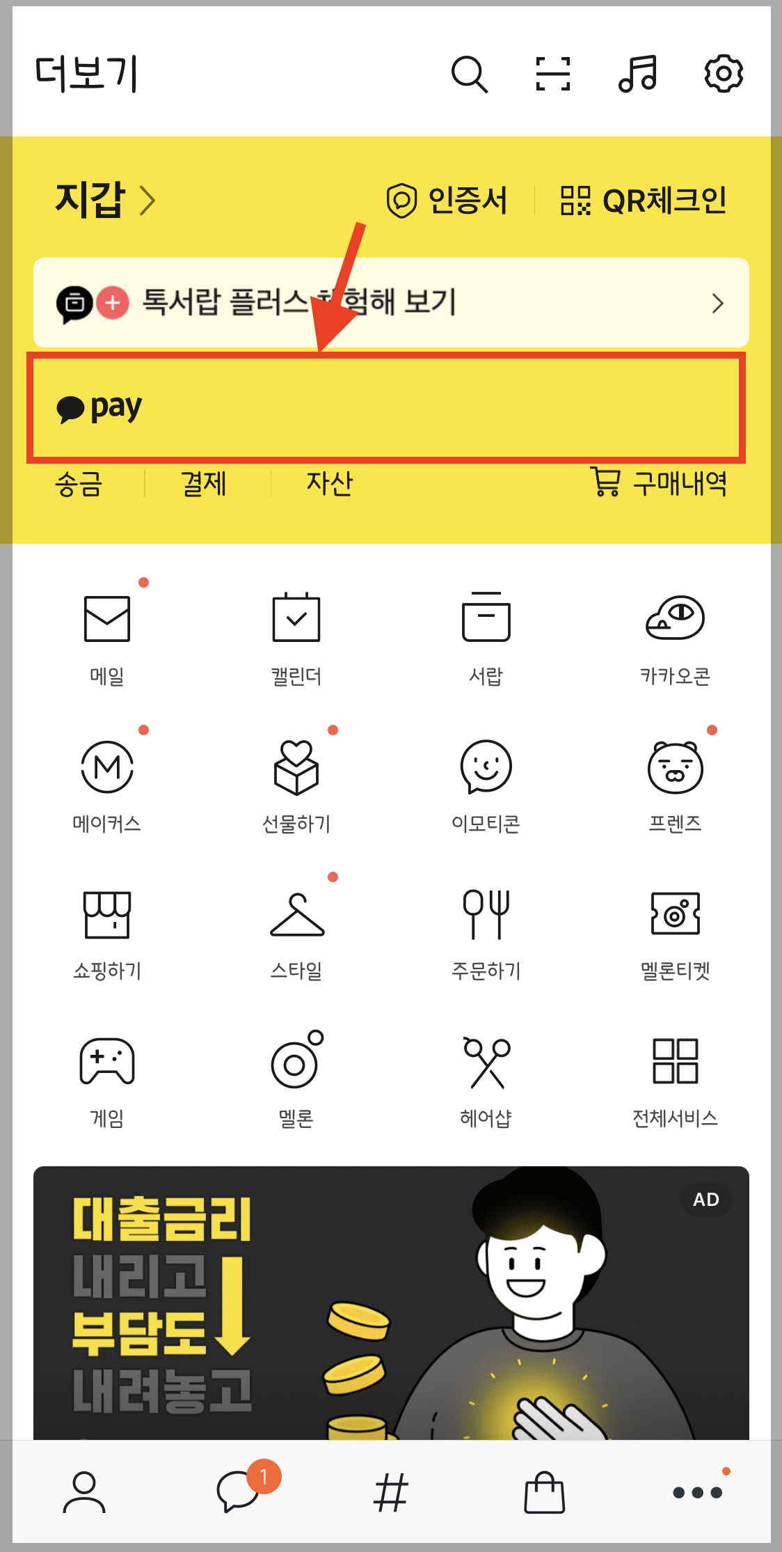 ▼ 아래와 같이 더보기 메뉴들이 나오는데요. 상단 노란색 카카오페이 메뉴를 누릅니다.