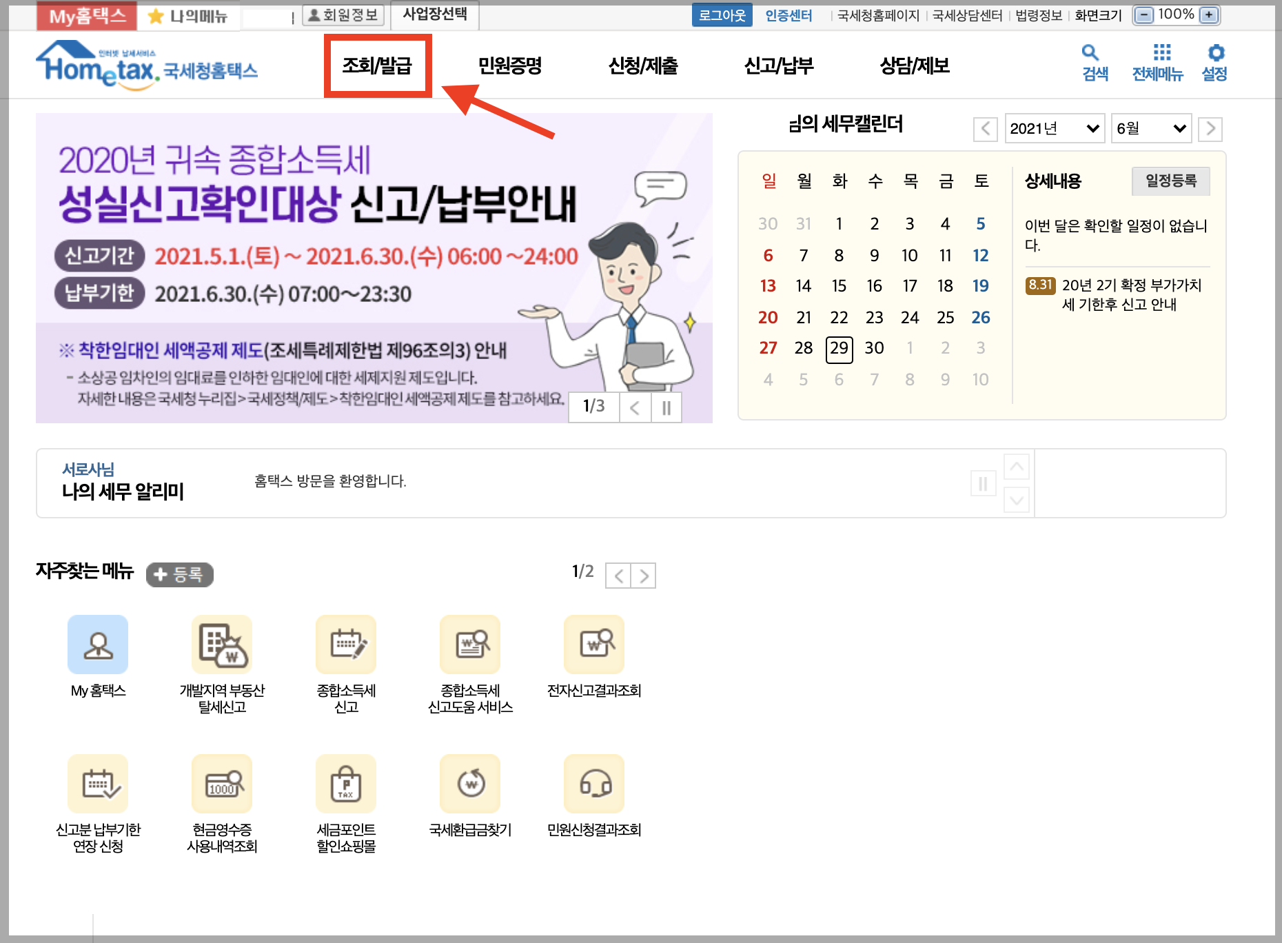 ▼ 먼저 국세청 홈택스에 접속한 뒤 로그인을 해주세요. 그리고 상단에 있는 메뉴 중 [조회/발급]을 눌러주세요.