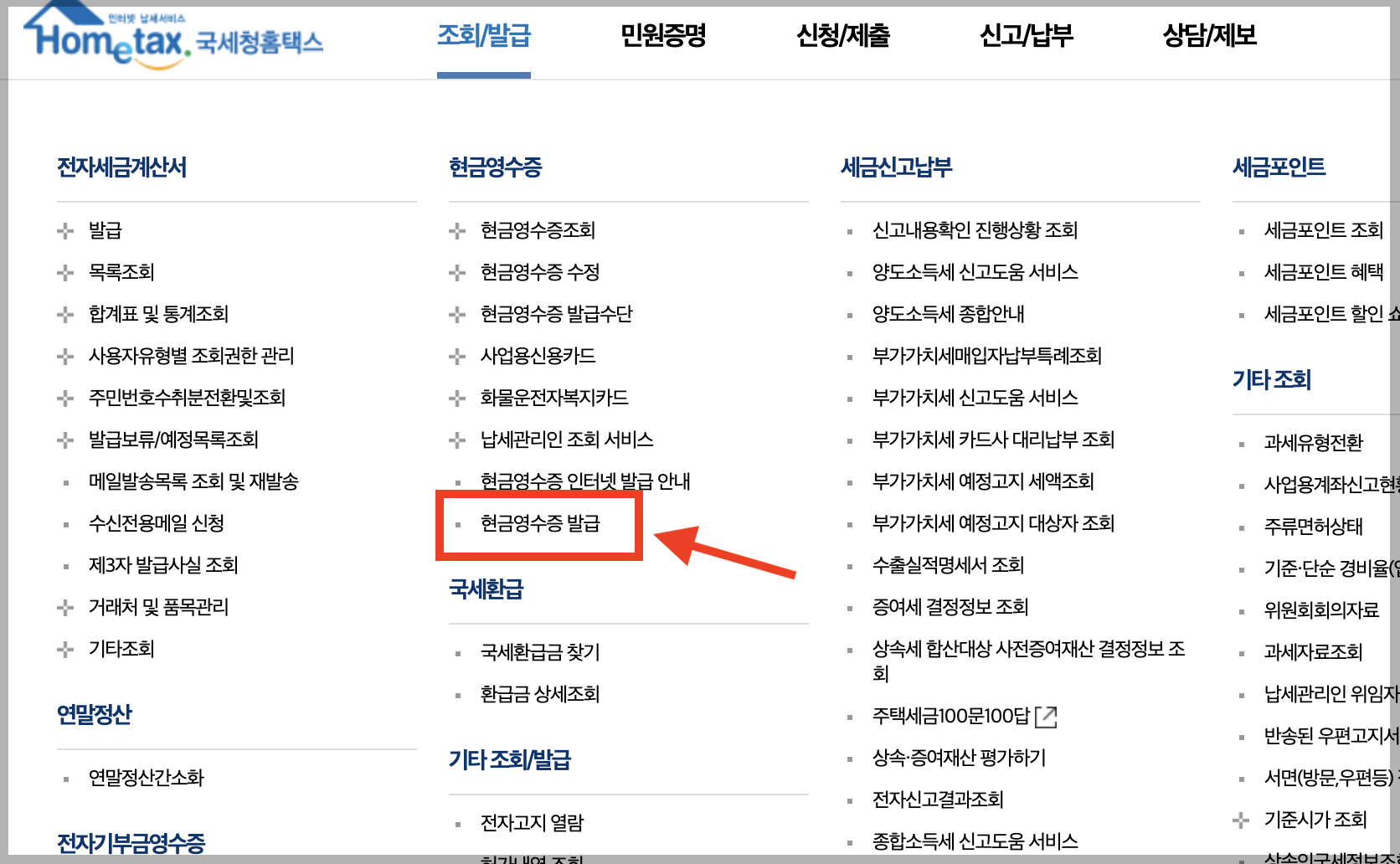 ▼ 아래와 같이 메뉴가 나오면 현금영수증 부분에서 [현금영수증 발급]을 선택합니다.