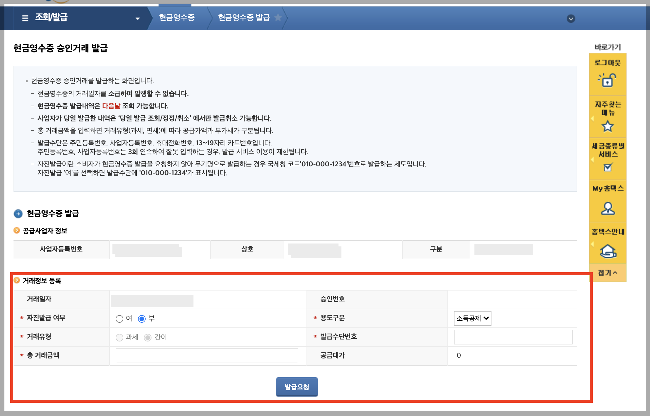 ▼ 이제 발급할 거래정보를 등록해준 뒤 [발급 요청]을 눌러줍니다.