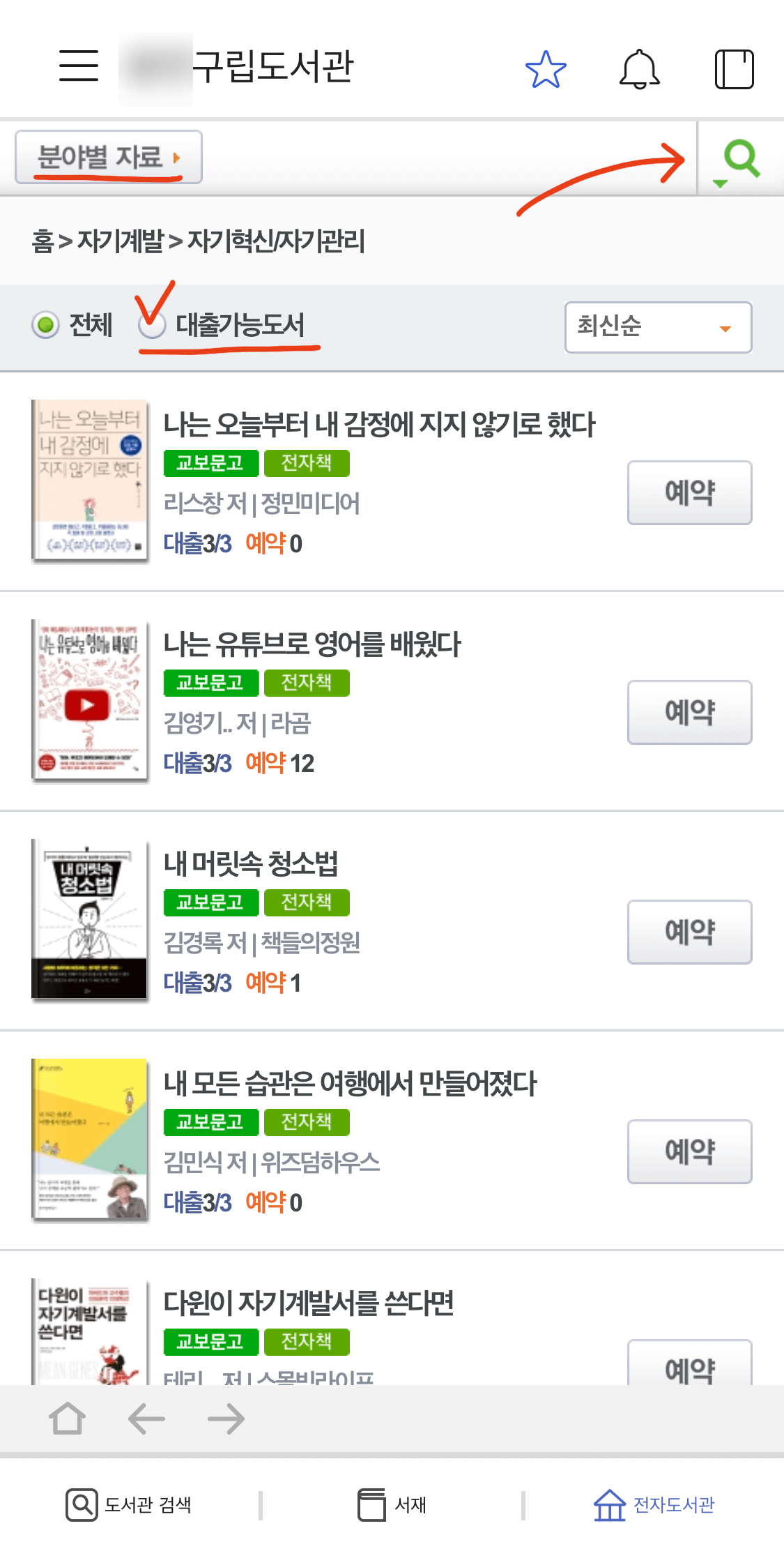 여러분이 이용하고 있는 도서관을 검색하고, 그 도서관 페이지에서 책을 검색합니다. 대출이 3/3이라고 되어있는 것들은 3권 중에 3권 모두 대출 중이라는 뜻입니다. 이러한 책은 예약을 해두면 됩니다. 책 한 권당 6일 동안 대출이 가능합니다.