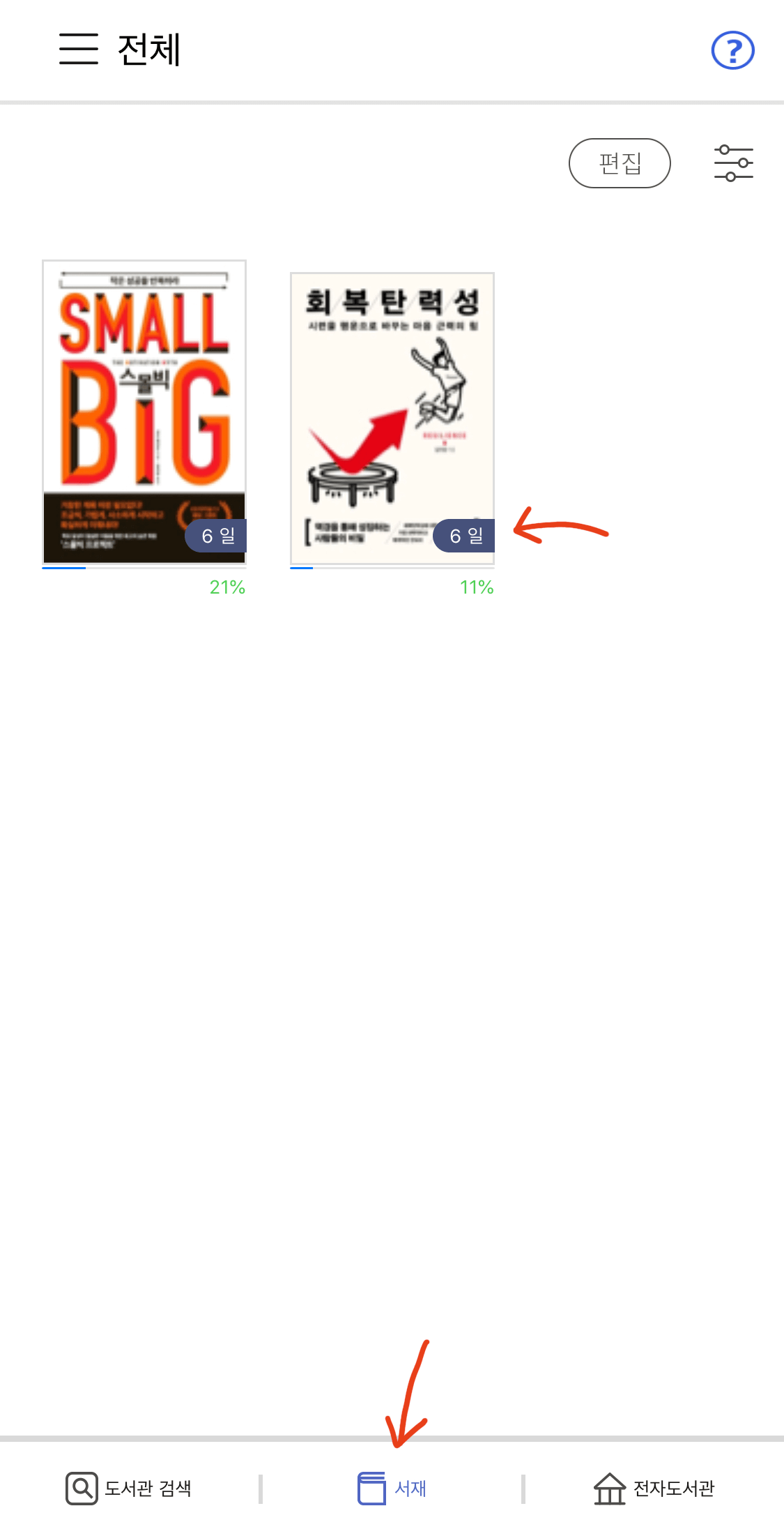 [서재] 항목에 들어가면 대여한 E-book 들을 한 번에 확인할 수 있습니다. 아래와 같이 책 아래 대여일과 읽은 양이 표시되어있습니다.