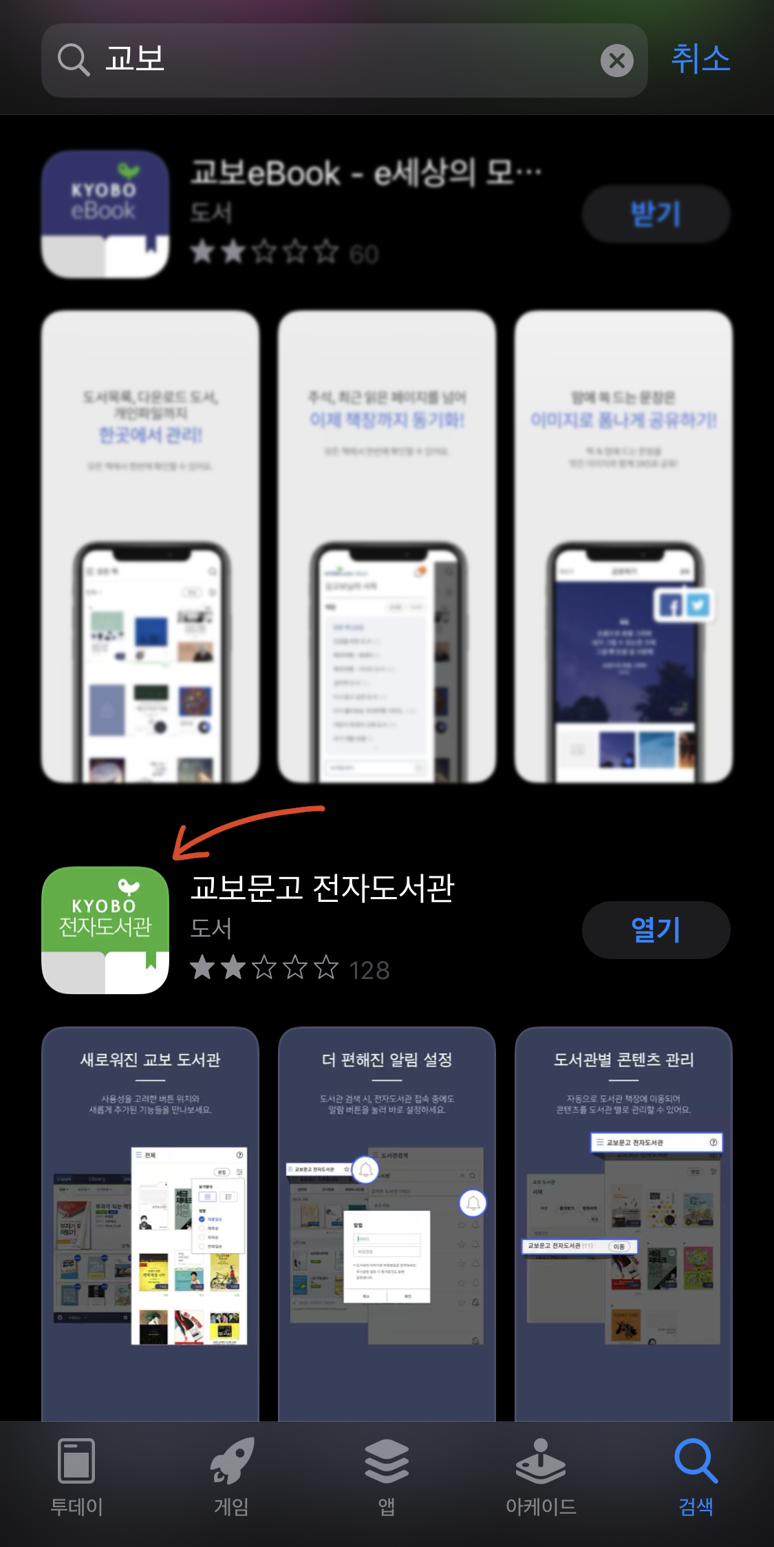 먼저 교보문고 전자도서관 어플리케이션을 다운로드합니다. 교보문고 전자도서관 서비스는 기존의 교보문고 E-book 과는 다른 서비스입니다. 전국의 도서관들과 연계하여 디지털로 E-Book을 대여해주는 서비스입니다. 아래를 보시면 '교보'라고 검색했을 때 나오는 어플인데 여기서 [교보문고 전자도서관]을 다운로드하으셔야 합니다.