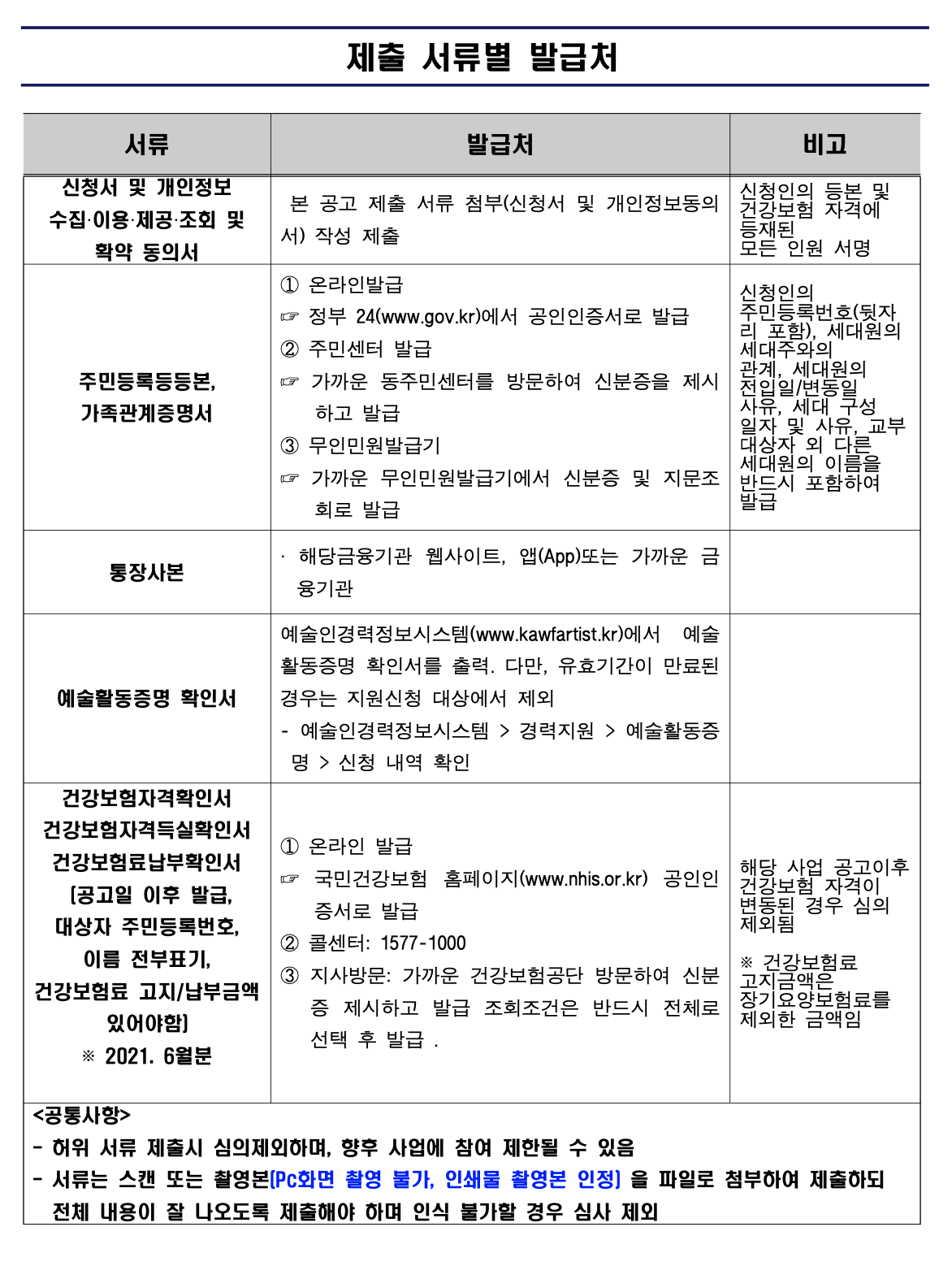 * 제출 서류 별 발급처는 아래 내용을 확인해주세요.