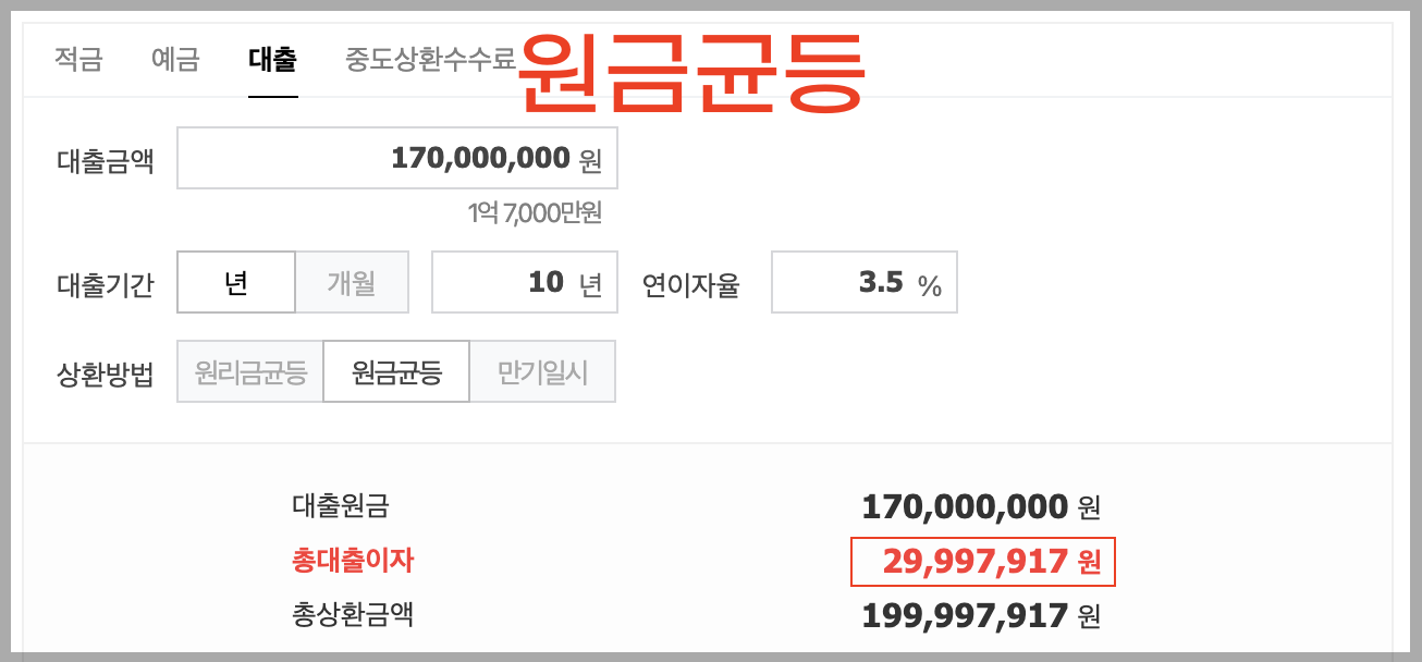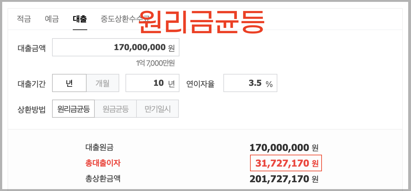 원리금균등상환은 원금과 이자의 금액을 합쳐서 매월 똑같은 금액을 갚는 것입니다. 따라서 초반에는 같은 금액일지라도 이자의 비중이 높습니다.