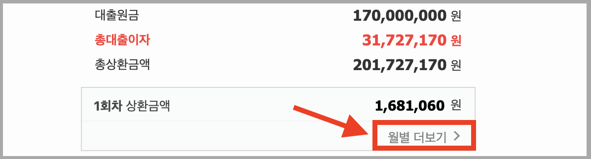 대출이자 계산기를 이용해서 조회한 뒤에, 아래에 있는 [월별 더보기]를 보면 매월 납부해야 할 예상 금액도 볼 수 있습니다.