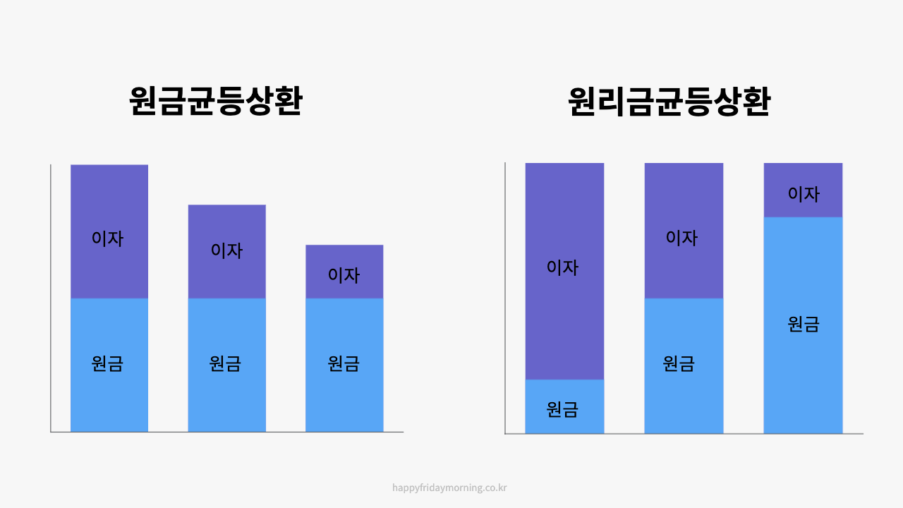 단순하게 생각하면, 원금균등상환은 처음에는 많이 내고 뒤로 갈수록 적게 내는 것이고, 원리금균등상환은 매월 똑같은 금액을 내는 방법입니다.