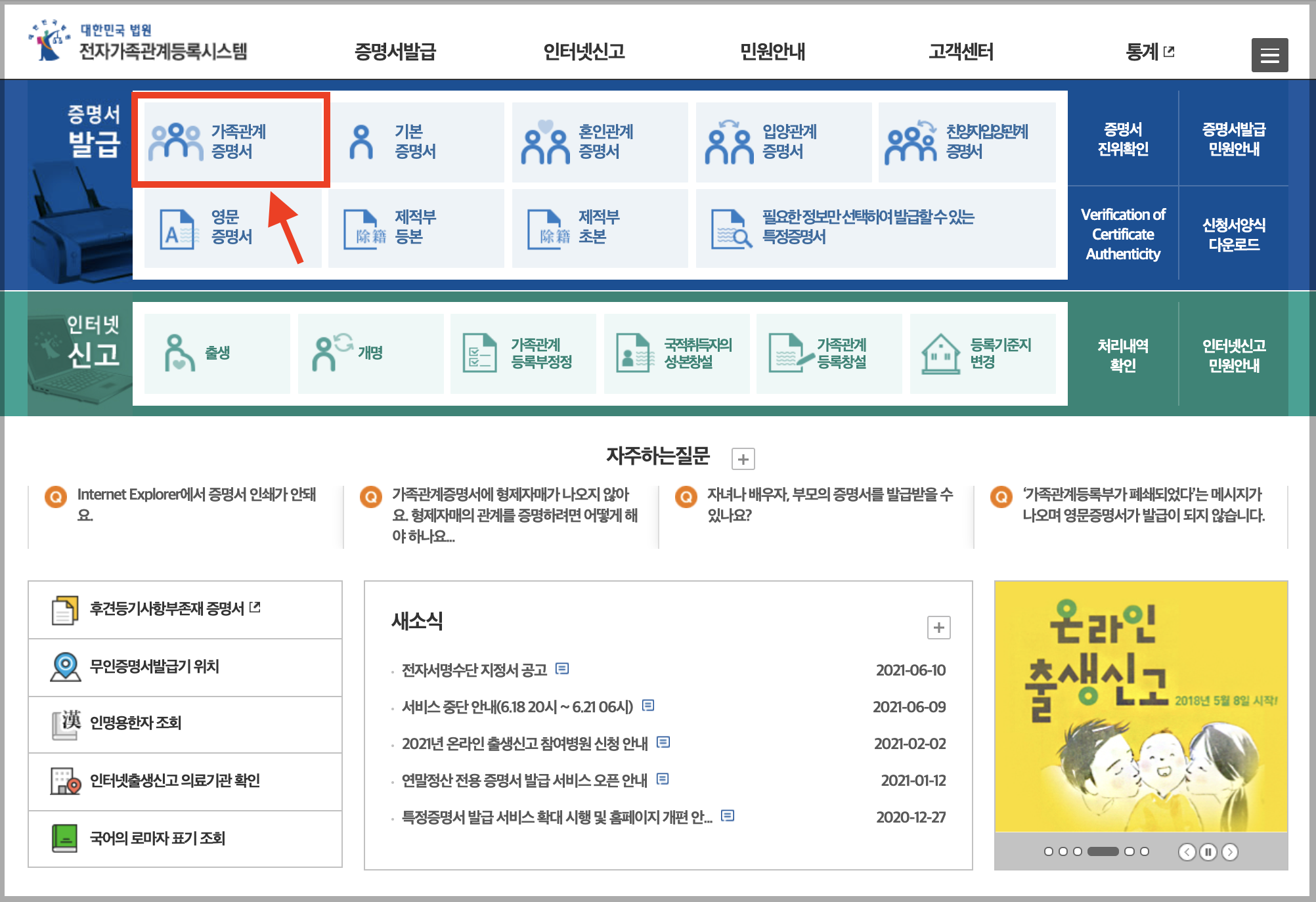 ▼ 먼저 대한민국 법원 전자가족관계등록시스템에 접속하면 메인화면에 [가족관계증명서] 발급 메뉴가 바로 보입니다.