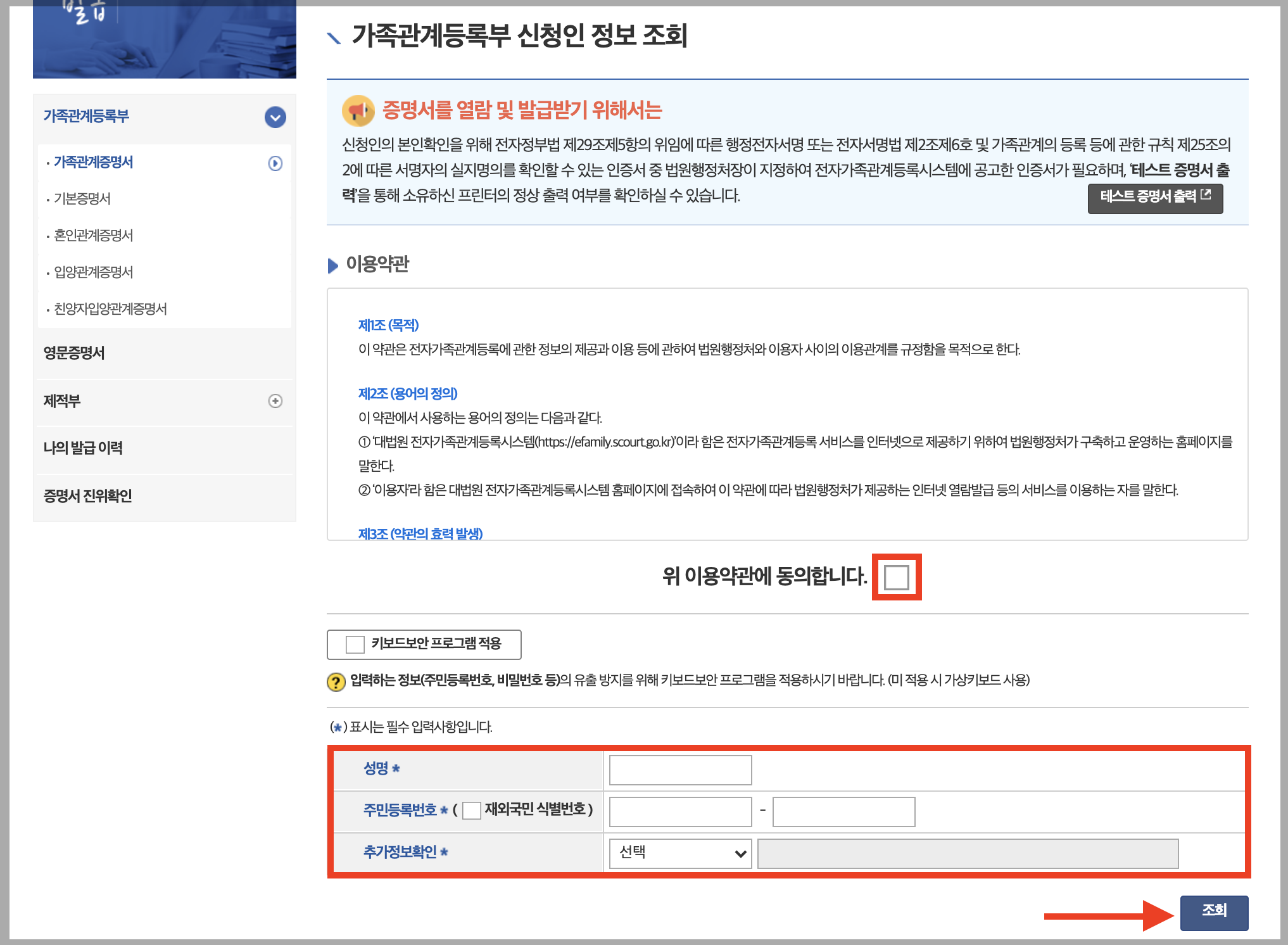 ▼ 메뉴를 선택하면 아래와 같은 화면이 나오는데, 약관에 동의하고 개인정보를 입력한 뒤 [조회]를 누릅니다. (추가정보확인은 부모님 이름이나 자녀의 이름을 선택하고 입력하면 됩니다.)
