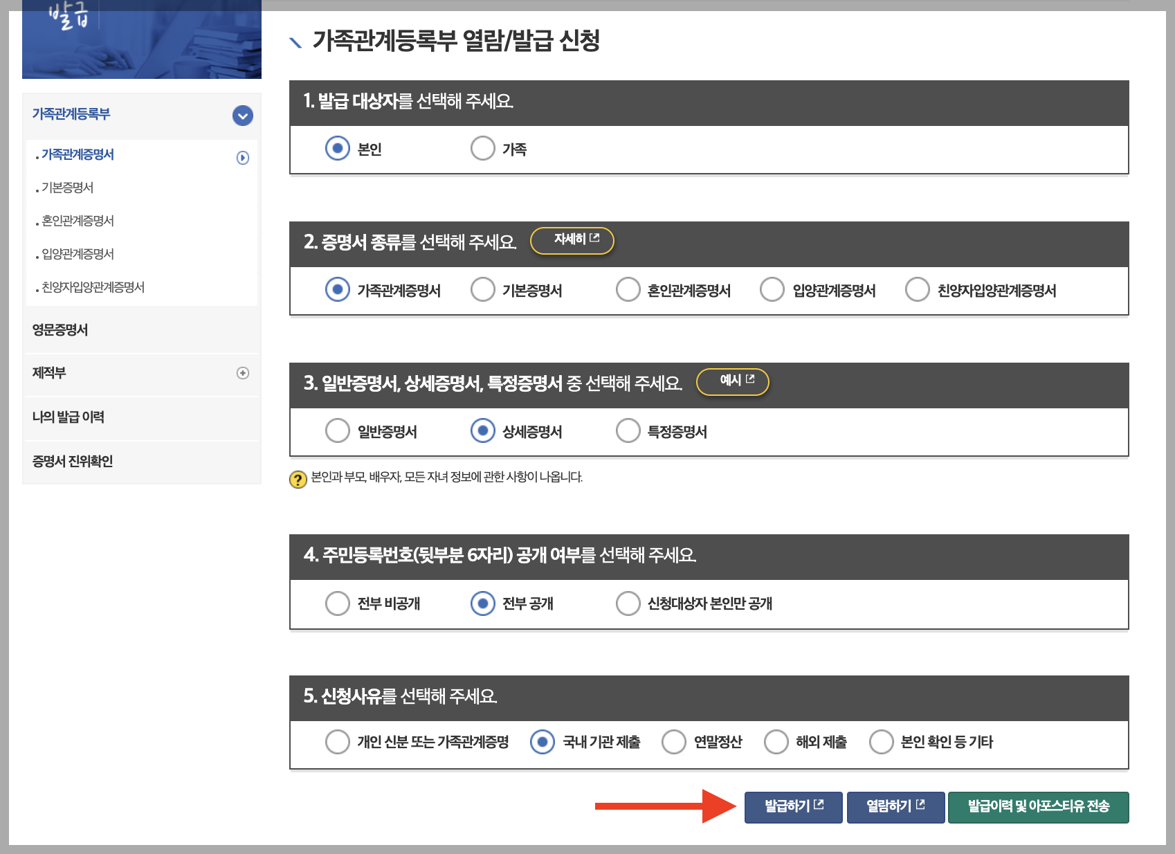 ▼ 인증서를 이용해서 본인확인을 완료하면 아래와 같이 서류 관련 선택 항목이 나옵니다.