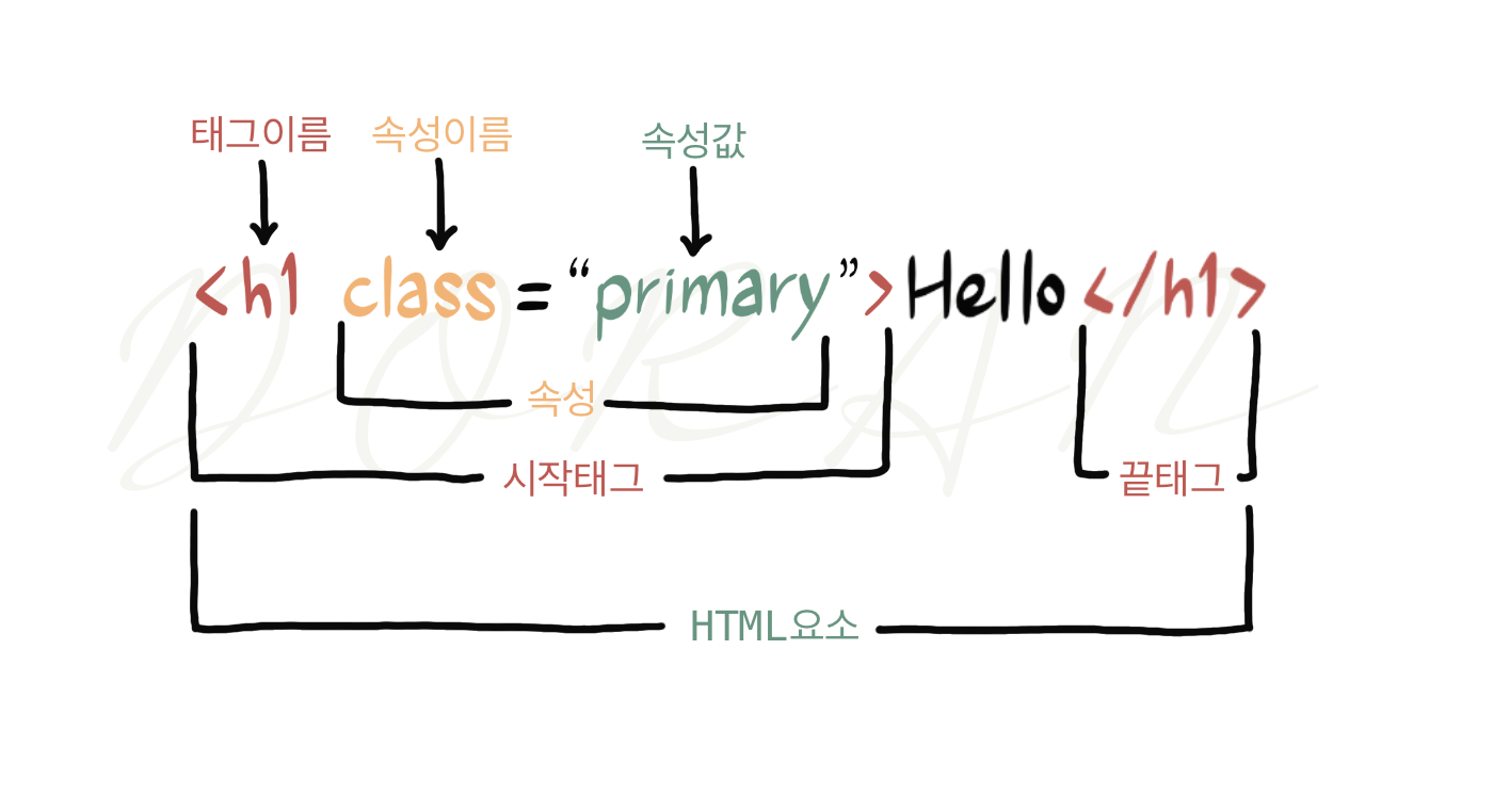 <h1>는 태그, class는 속성이름, primary는 속성값 입니다. 이것들이 합쳐져서 Element(요소)가 되는 것입니다.