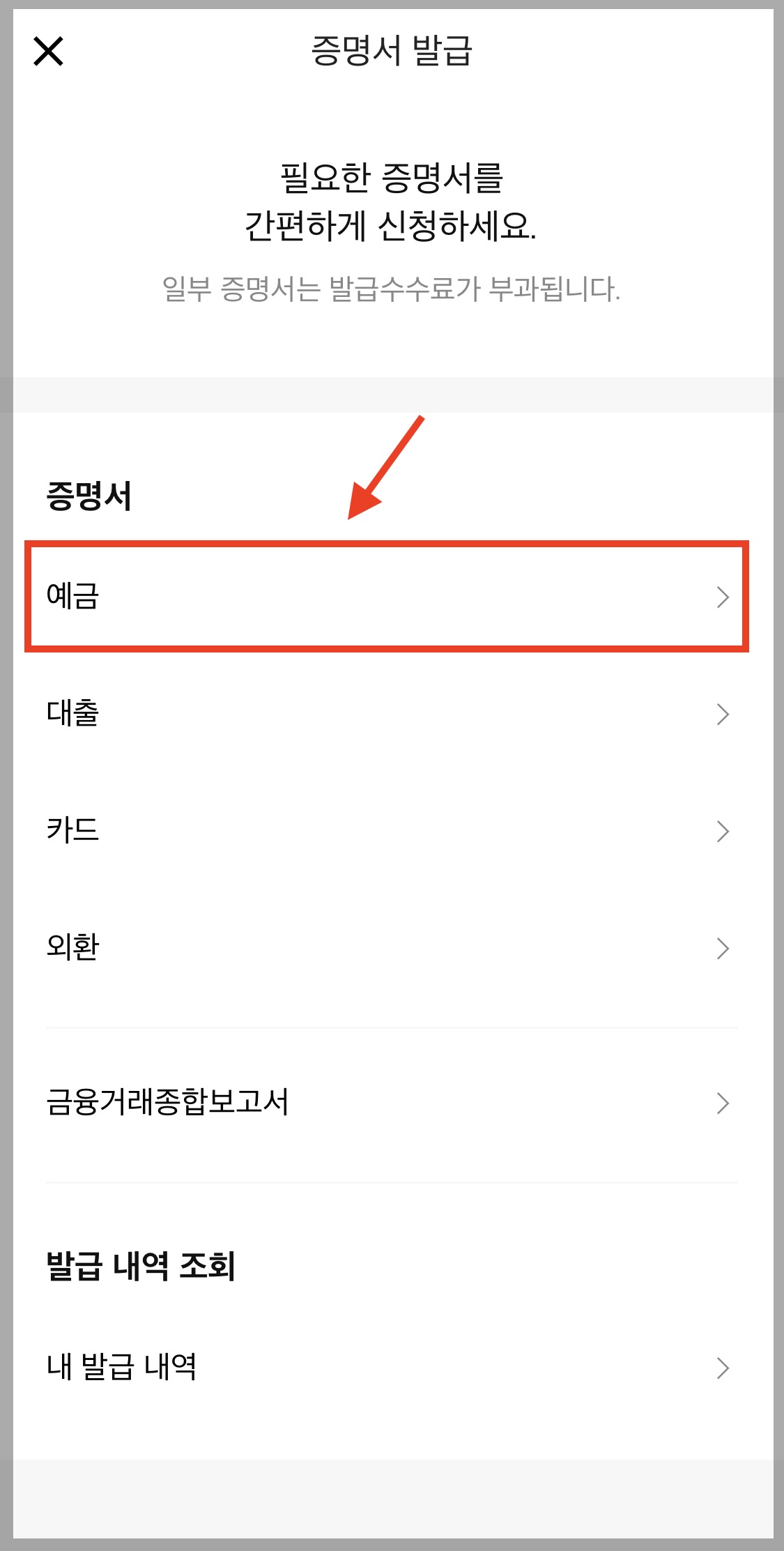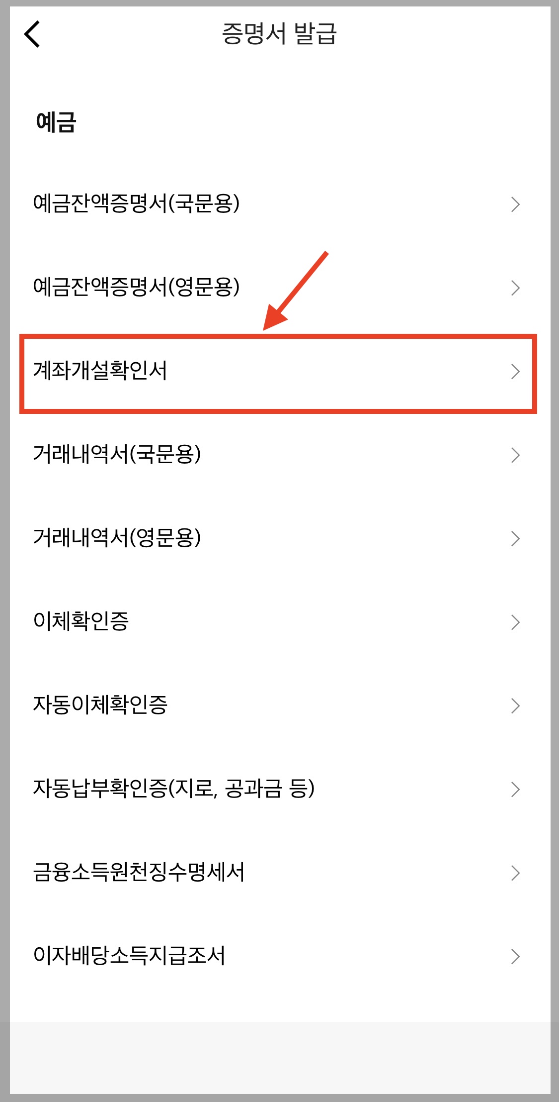 ▼ 사용하고 있는 예금통장 계좌 개설 확인서가 필요하기 때문에 [예금]을 선택합니다.
