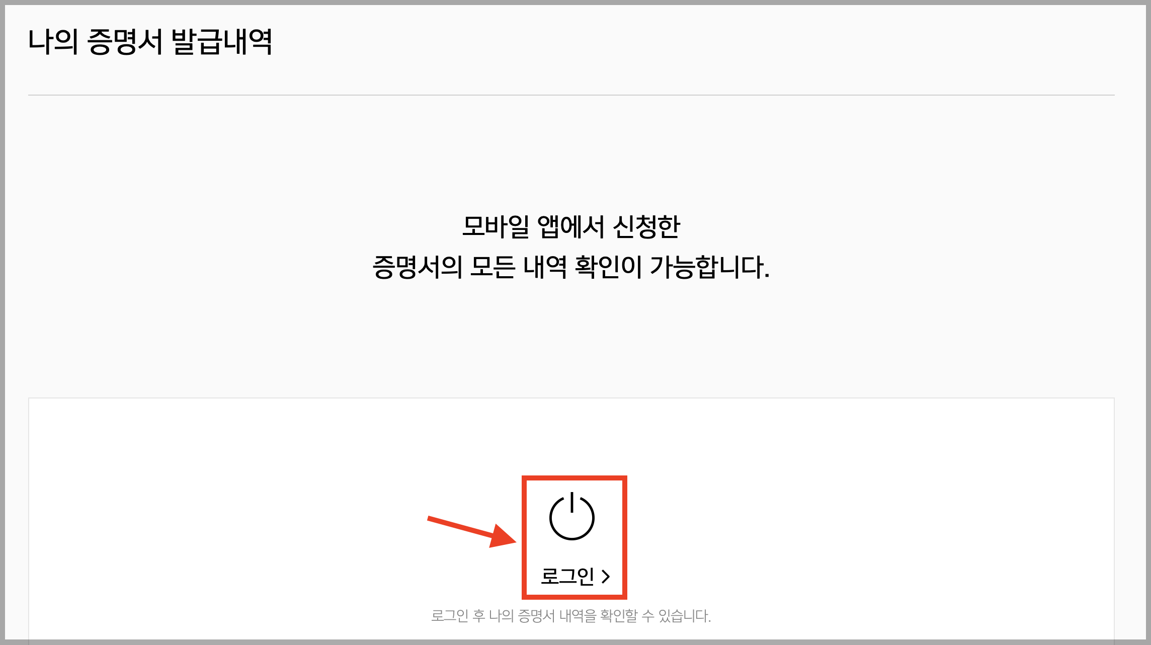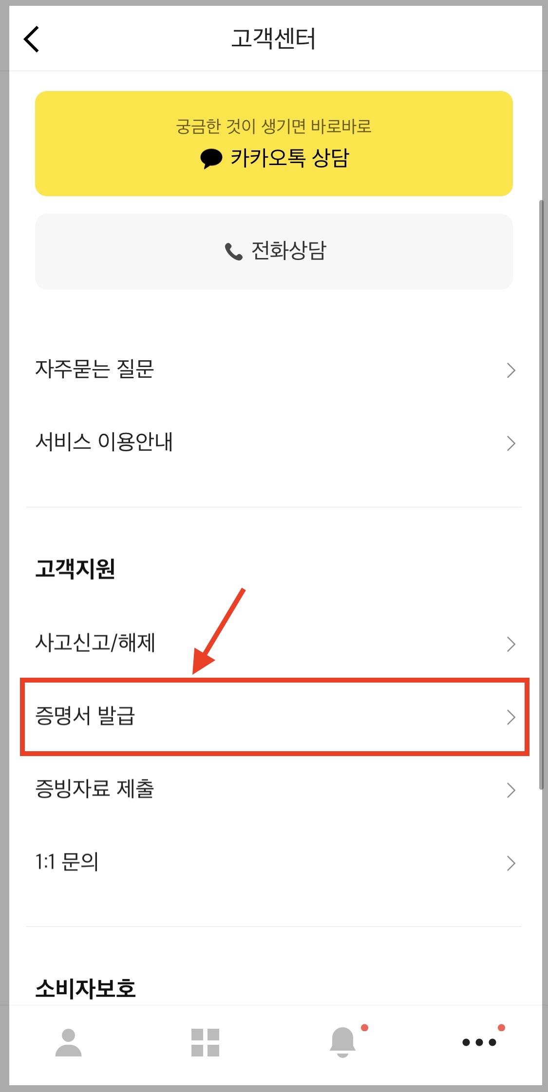 ▼ 고객지원 하위 메뉴에 있는 [증명서 발급]을 선택합니다.