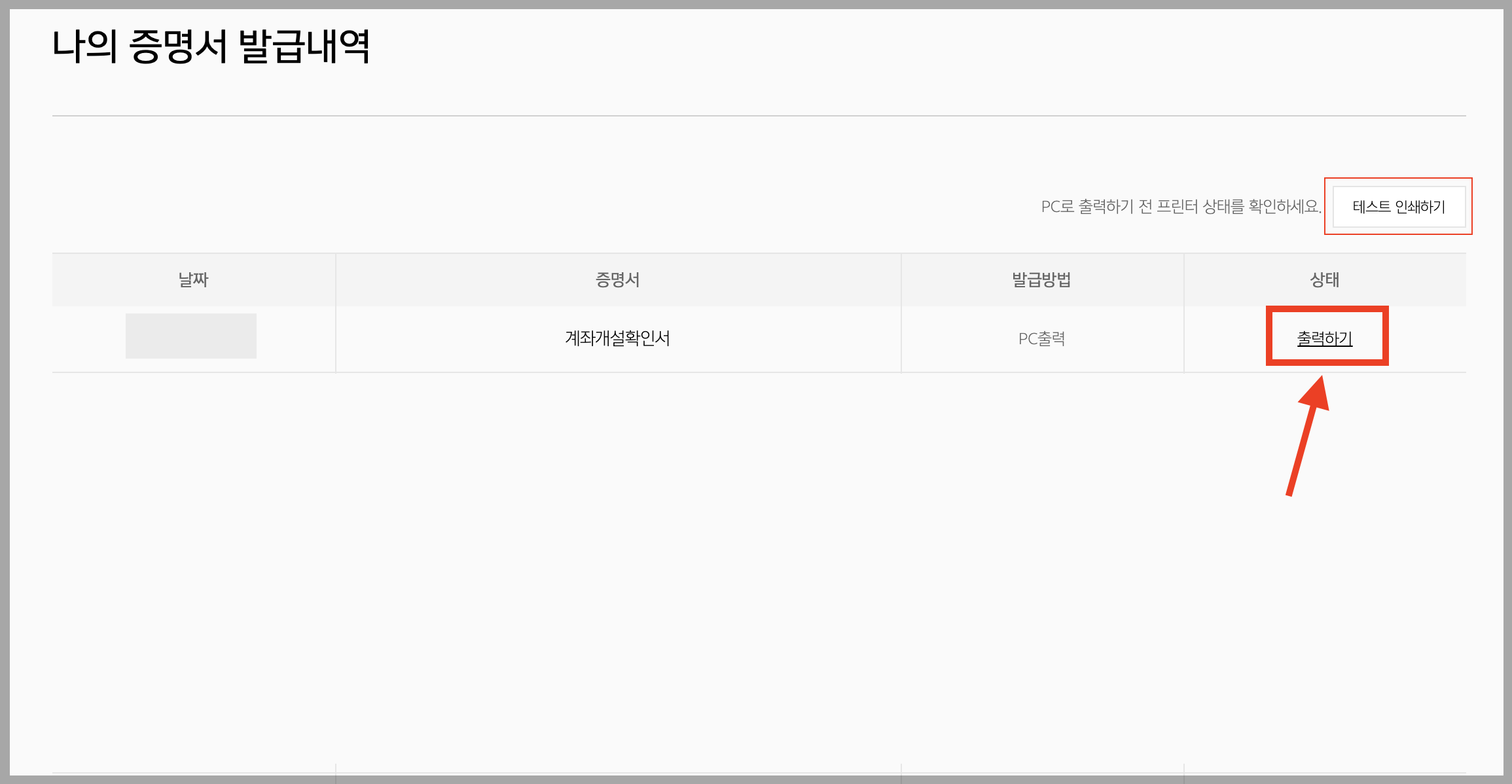 ▼ 자동으로 로그인이 되면서 아래와 같이 계좌개설확인서 [출력하기]버튼이 나옵니다. (테스트 인쇄하기를 해보는 것이 좋습니다.)
