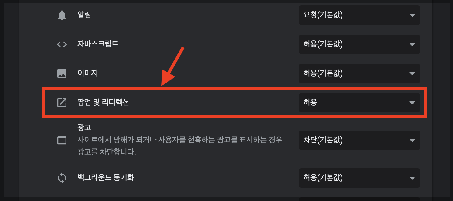 그리고 팝업 및 리디렉션을 허용으로 해주세요.