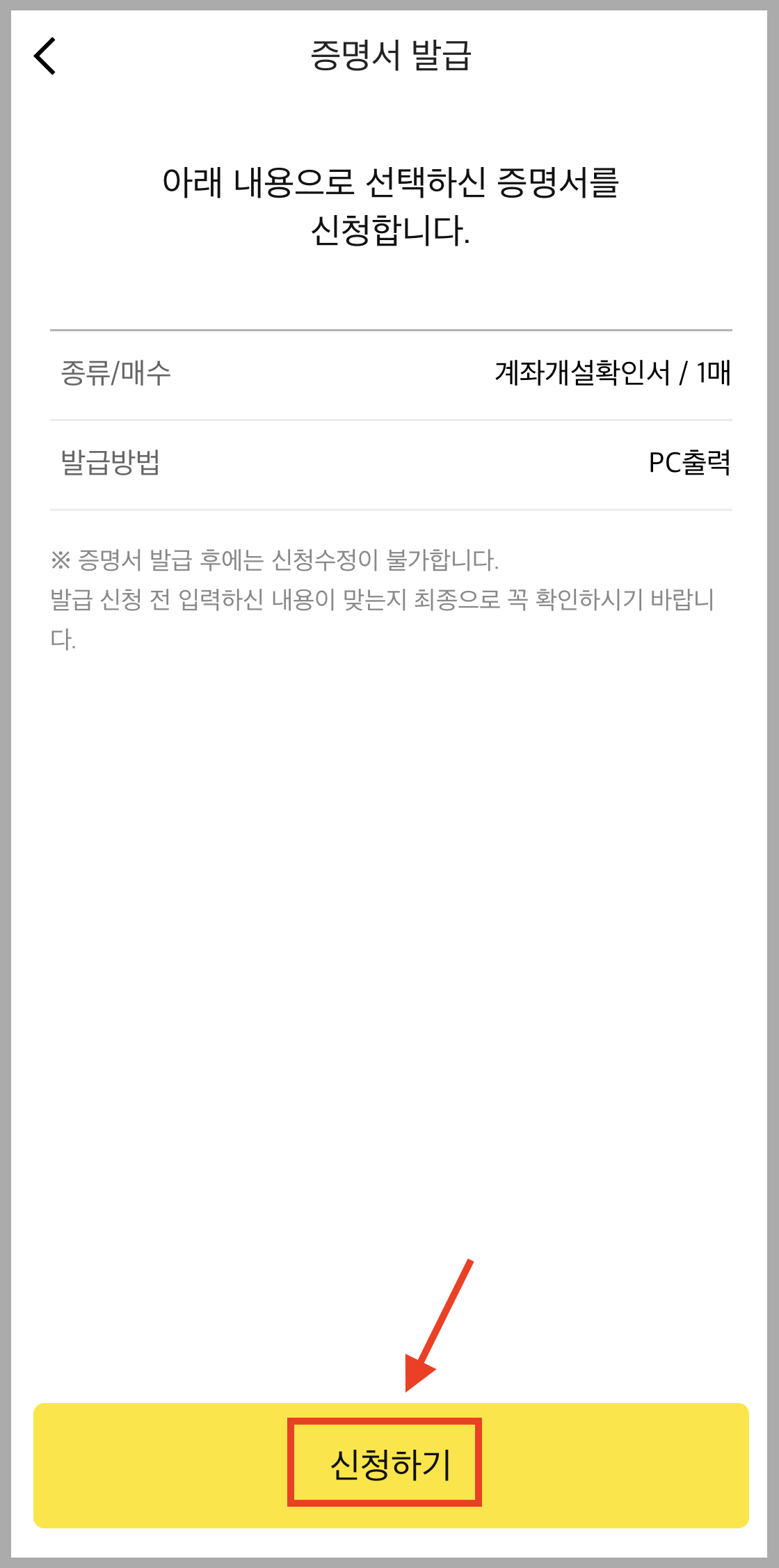 ▼ 마지막으로 증명서 발급 내용을 확인한 뒤 [신청하기]를 누릅니다.