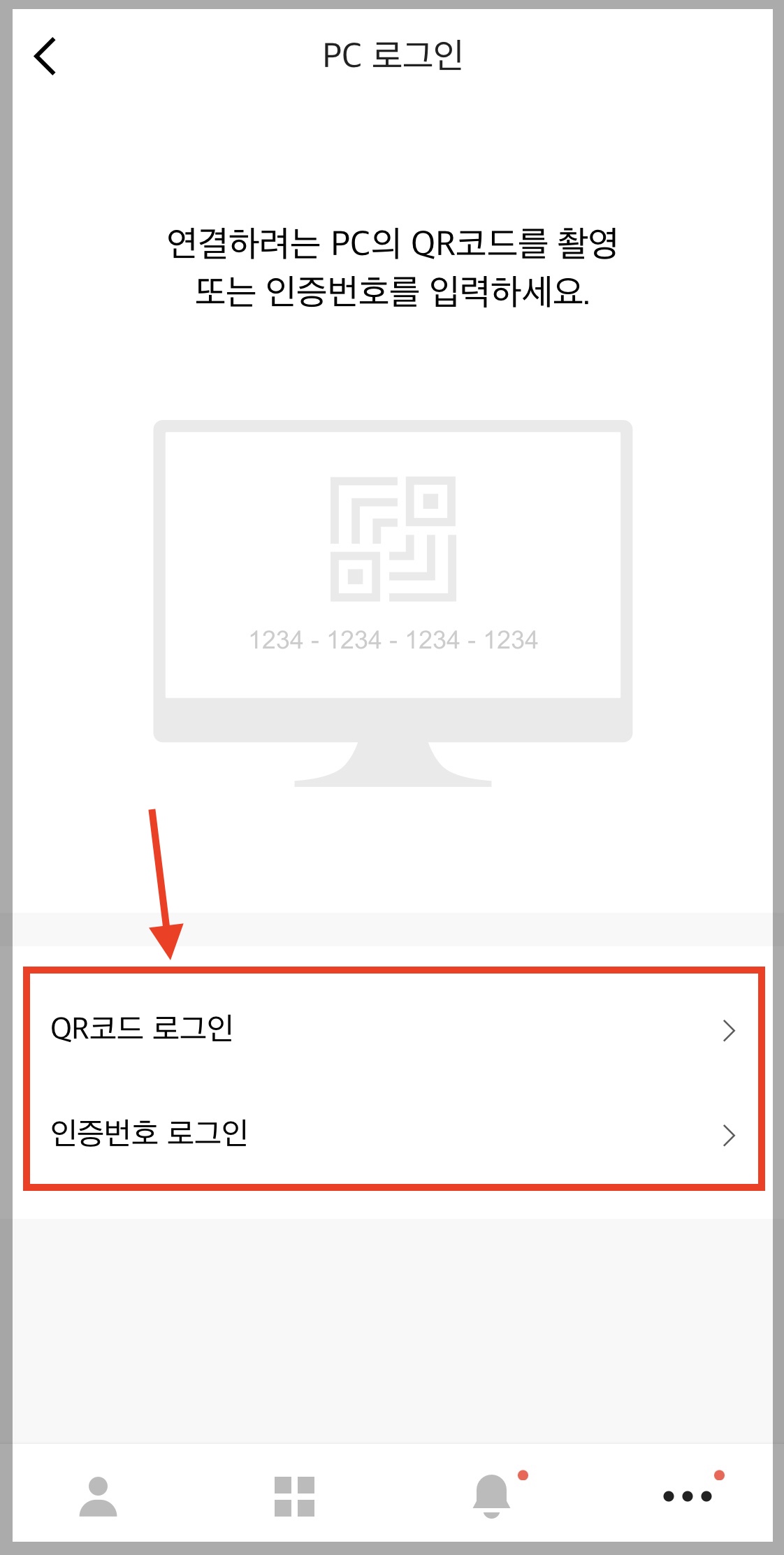 ▼ QR코드 혹은 인증번호를 선택한 뒤에 PC 화면에 로그인을 해줍니다.