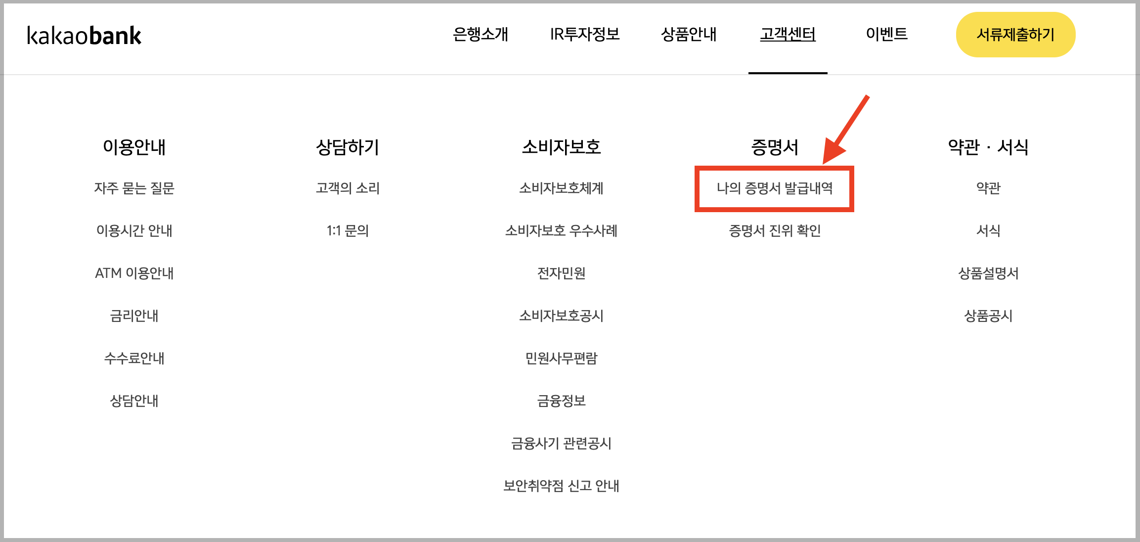 위에서도 나와있듯이, 카카오뱅크 계좌개설확인서를 출력하기 위해서는 PC에서 홈페이지 https://www.kakaobank.com 으로 접속한 뒤 '나의 증명서 발급내역'에서 출력합니다.