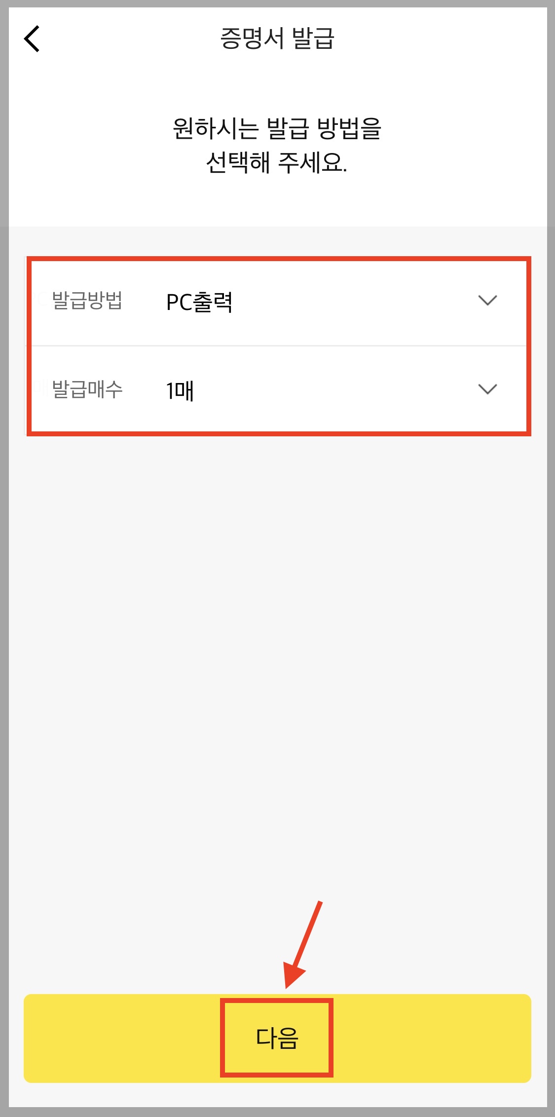 ▼ PC를 이용해서 출력할 것이기 때문에, 발급방법은 [PC출력], 발급매수는 원하는 매수를 선택합니다. 그리고 [다음]을 누릅니다.