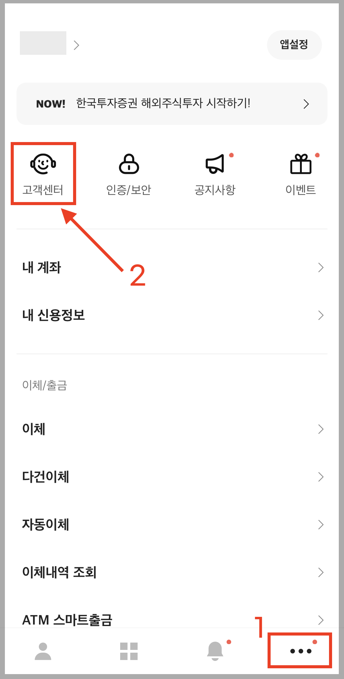 ▼ 먼저 카카오뱅크 하단에 있는 점 세 개 메뉴를 누르고 난 뒤, 왼쪽 위에 있는 [고객센터]를 선택합니다.