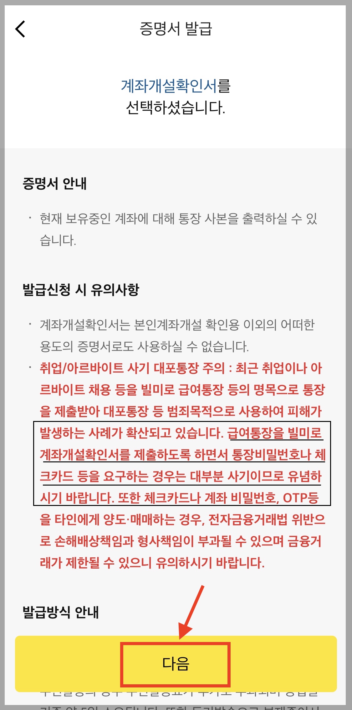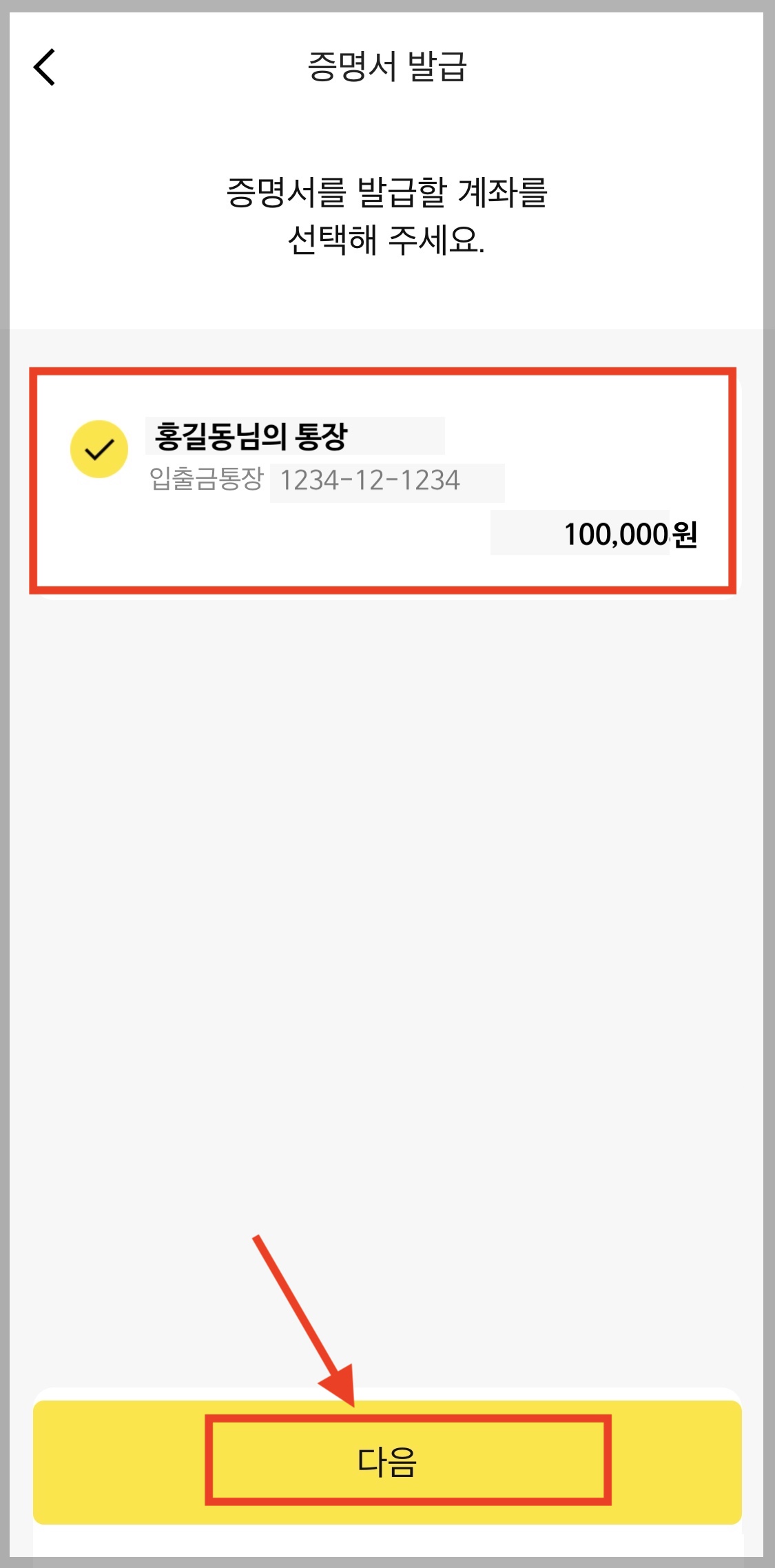 ▼ 증명서를 발급할 계좌를 선택합니다. 그리고 [다음]을 누릅니다.