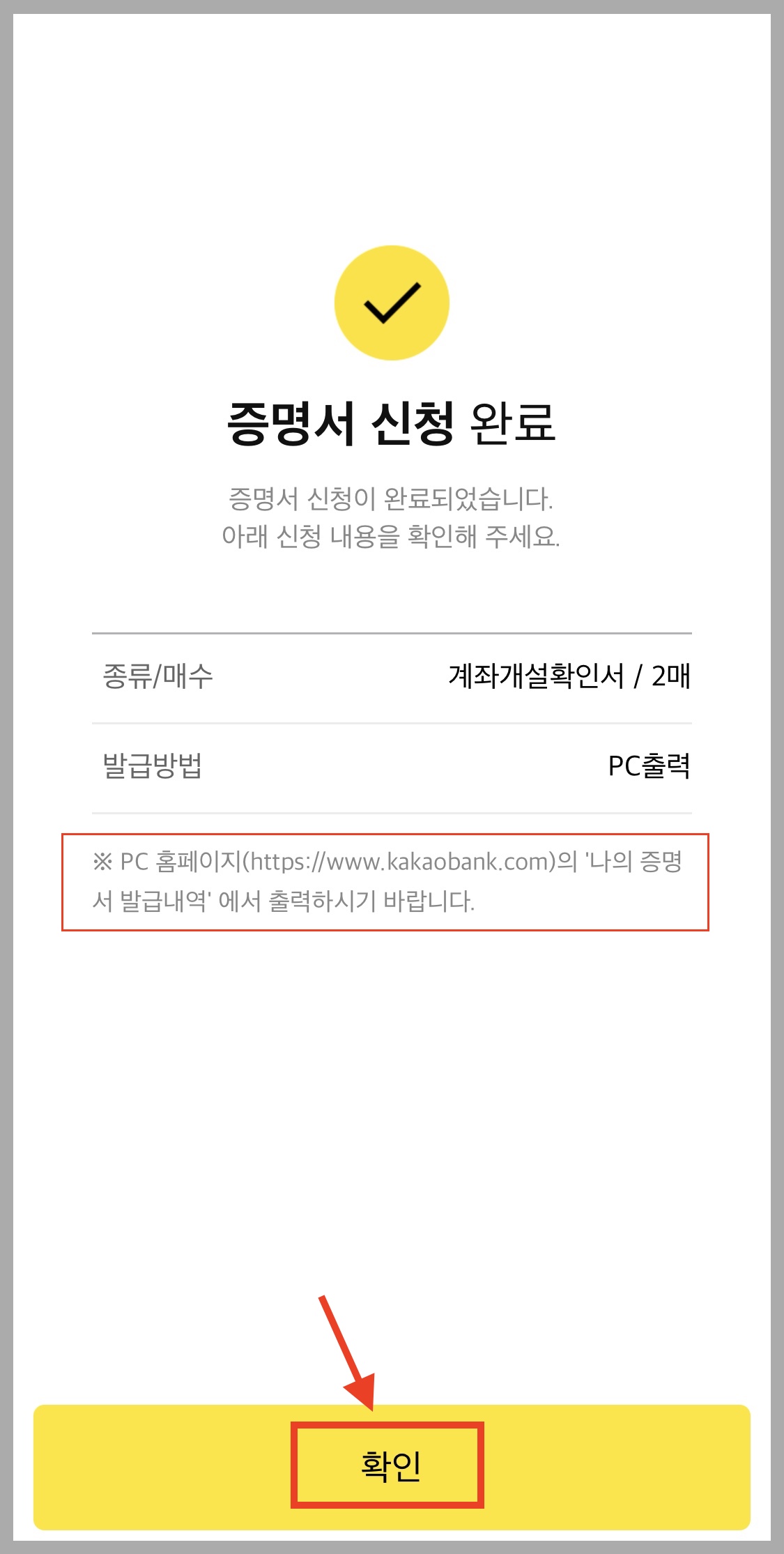 ▼ 카카오뱅크 계좌개설확인서 증명서 신청이 완료되었습니다.