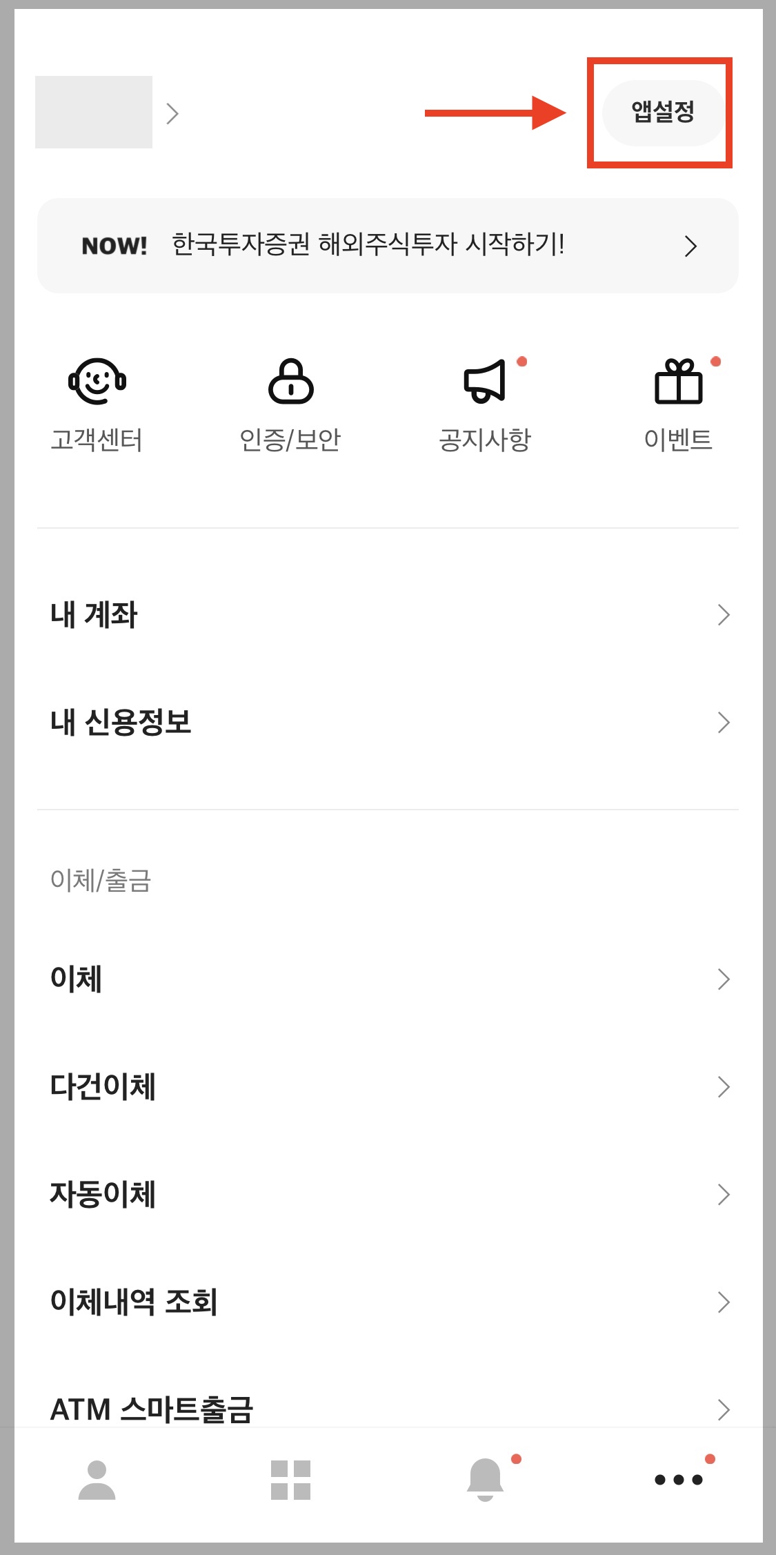 ▼ 모바일 카카오뱅크의 [앱설정] 메뉴로 들어갑니다.