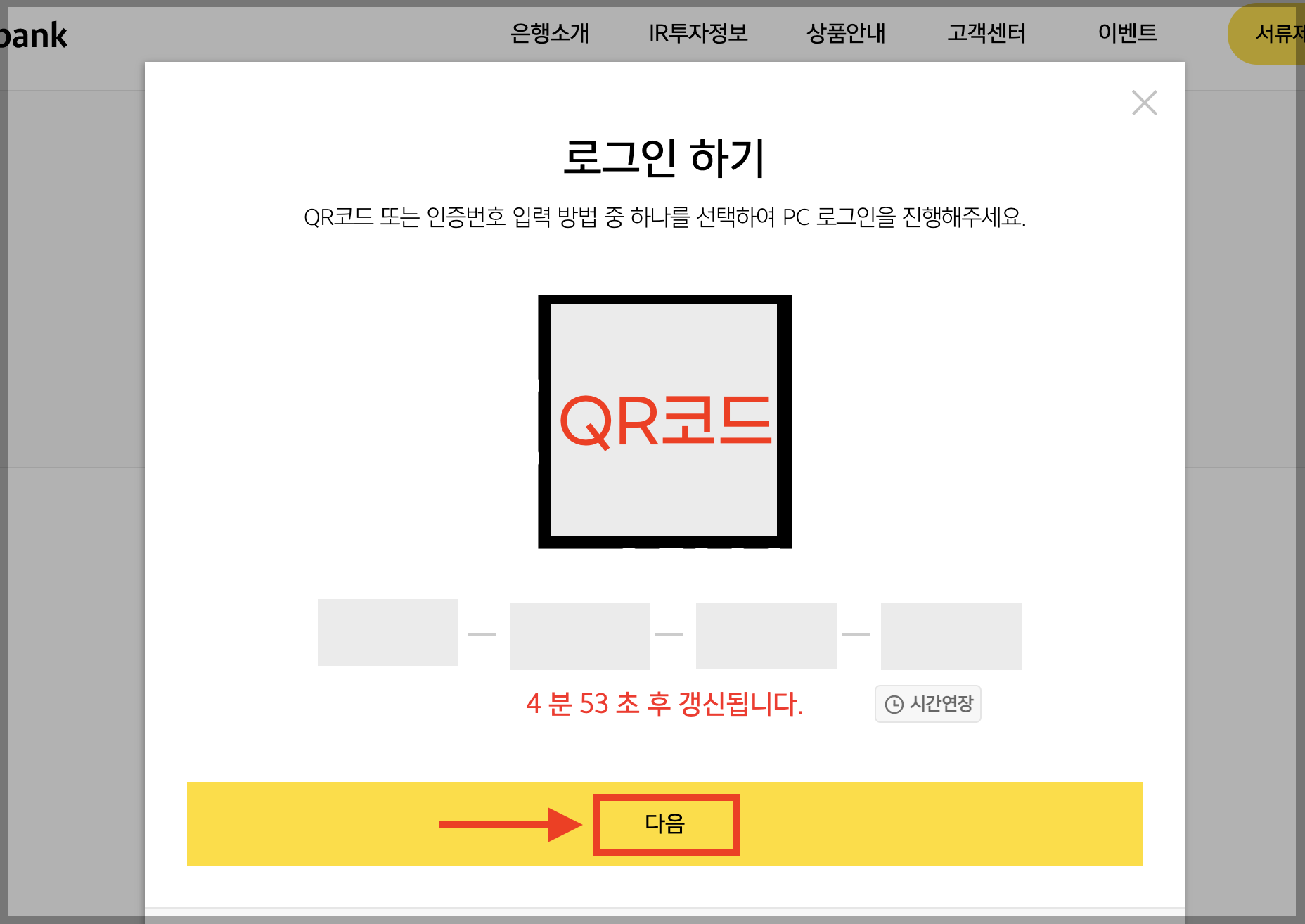 ▼ 로그인을 위한 QR코드와 인증번호가 나옵니다. (둘 중에 하나로 로그인 가능합니다.)