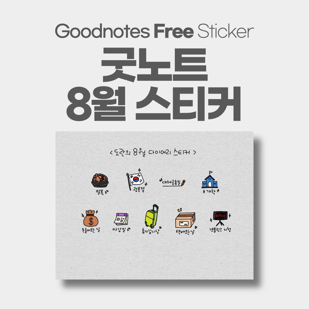안녕하세요 도란입니다 :) 오늘은 아이패드 굿노트에서 사용할 수 있는 8월 스티커를 가지고 왔습니다. 다른 달과 겹치는 것들이 많아서 부족한 스티커들은 다른 스티커들을 함께 사용해도 좋을 것 같습니다. 이번에는 8월에 개학하는 학교가 대부분인 것 같습니다. 그래서 8월 스티커에 개학을 추가로 넣어보았습니다.