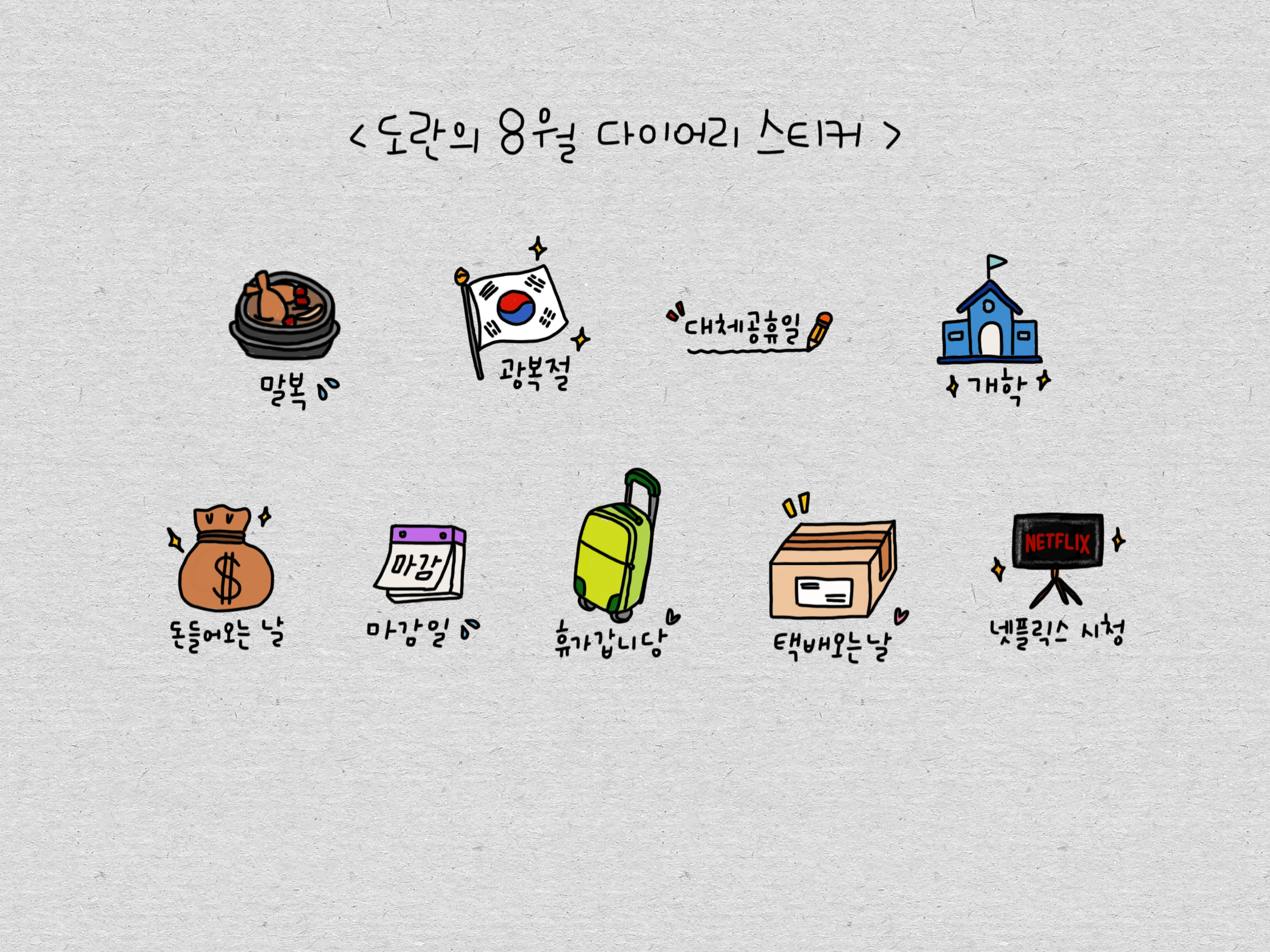 안녕하세요 도란입니다 :) 오늘은 아이패드 굿노트에서 사용할 수 있는 8월 스티커를 가지고 왔습니다. 다른 달과 겹치는 것들이 많아서 부족한 스티커들은 다른 스티커들을 함께 사용해도 좋을 것 같습니다. 이번에는 8월에 개학하는 학교가 대부분인 것 같습니다. 그래서 8월 스티커에 개학을 추가로 넣어보았습니다.
