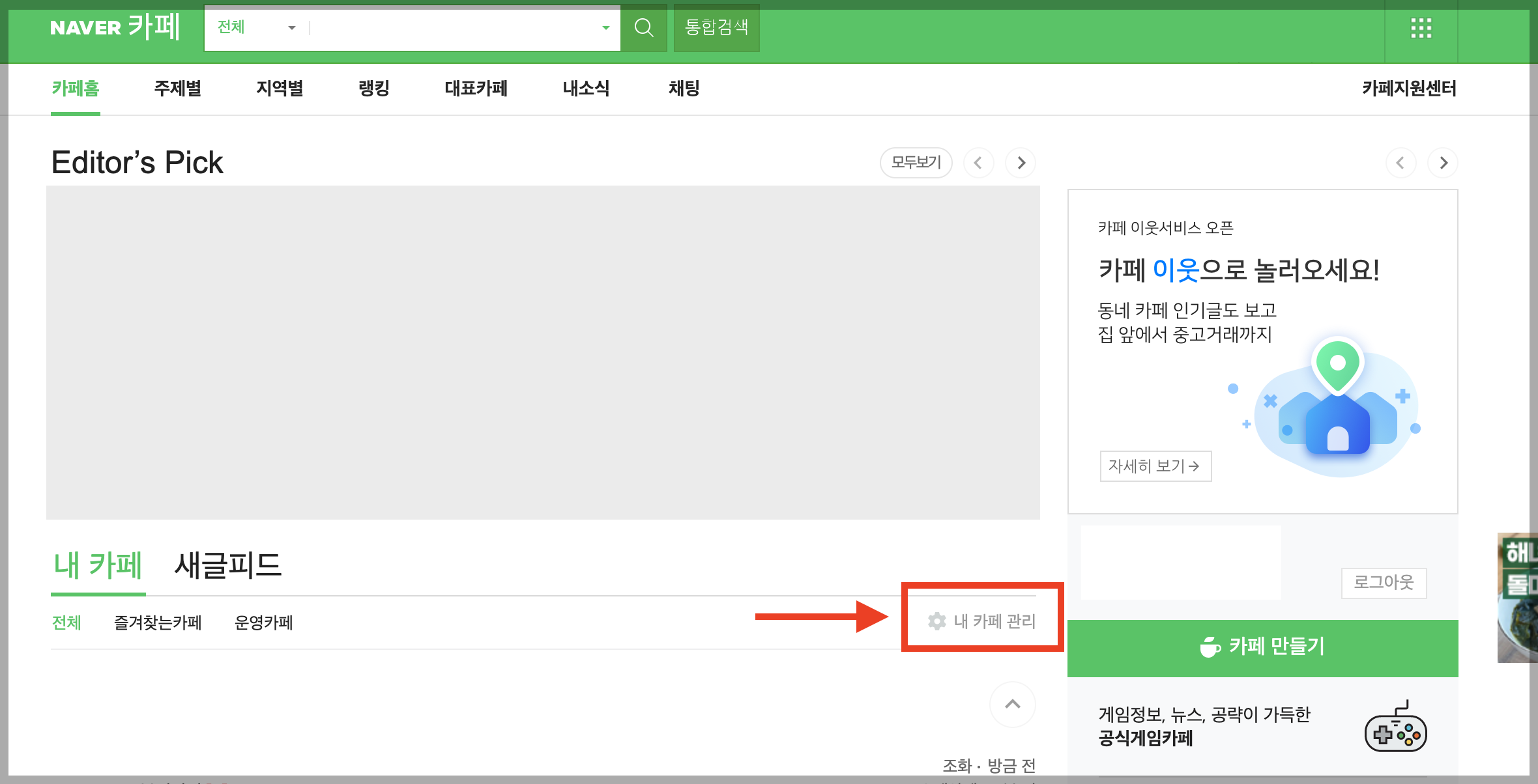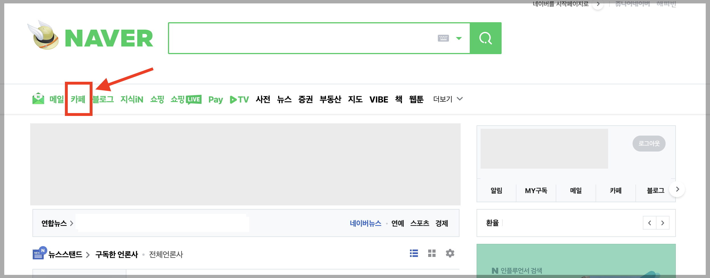 ▼ 먼저 네이버에 로그인을 한 뒤, [카페] 메뉴로 들어가주세요.