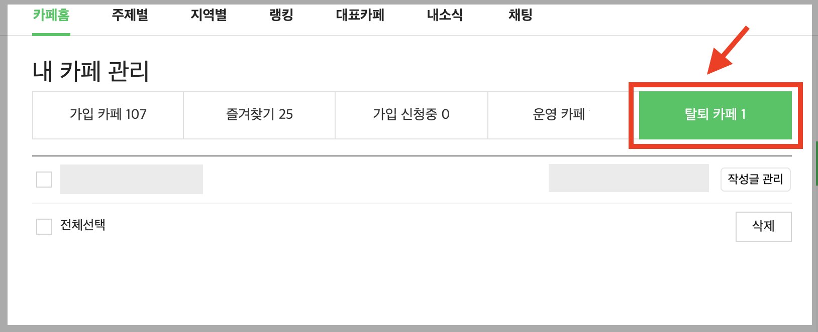 ▼ 네이버 카페를 탈퇴한다고 해서 목록이 전부 사라지지 않습니다. [탈퇴 카페]메뉴에 들어가서 한번 더 삭제를 해주어야 합니다. 이곳에서 [작성글 관리]에 들어가서 내가 쓴 글들을 관리할 수 있습니다.