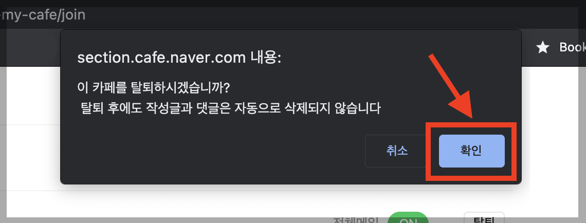 ▼ 아래와 같은 팝업창이 나오는데, [확인] 버튼을 누릅니다. 카페를 탈퇴한 후에도 내가 작성한 글은 삭제할 수 있습니다.