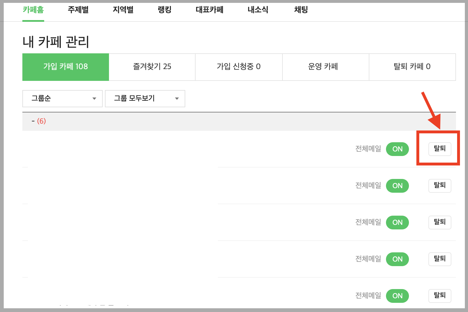 ▼ 그리고 카페명 오른쪽에 있는 [탈퇴] 버튼을 누릅니다.