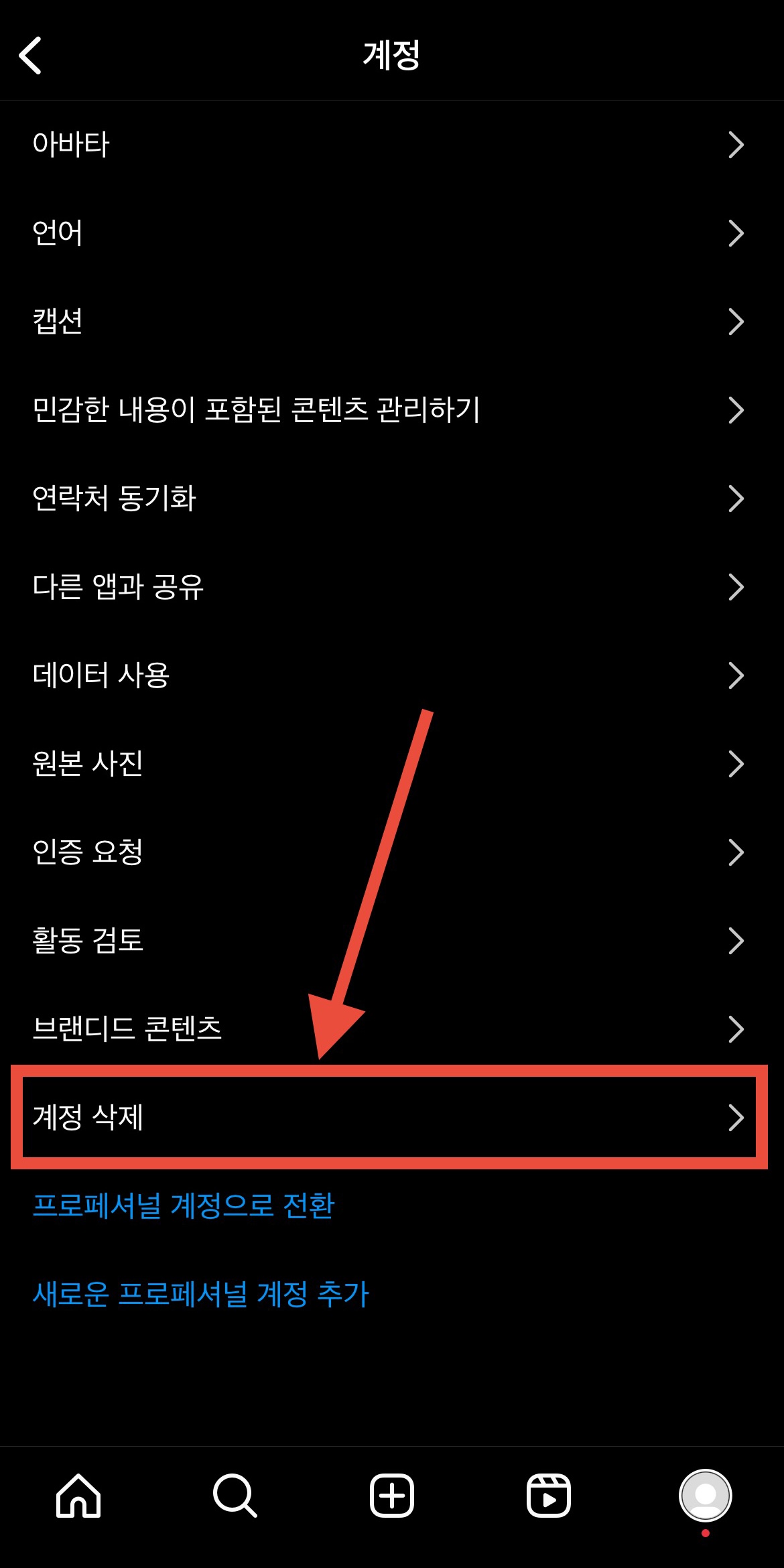 ▼ 두 번째 메뉴에 있는 [계정 삭제]를 누릅니다.