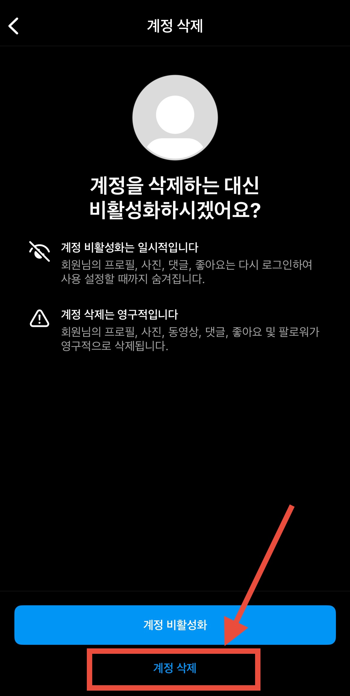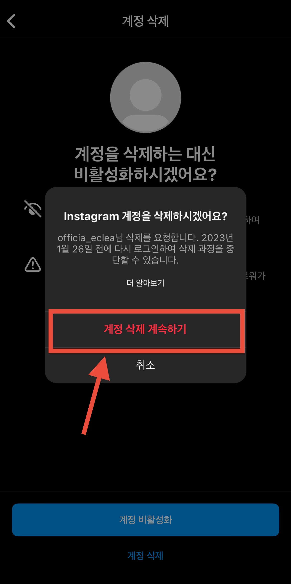 ▼ [계정 삭제 계속하기] 를 선택합니다.