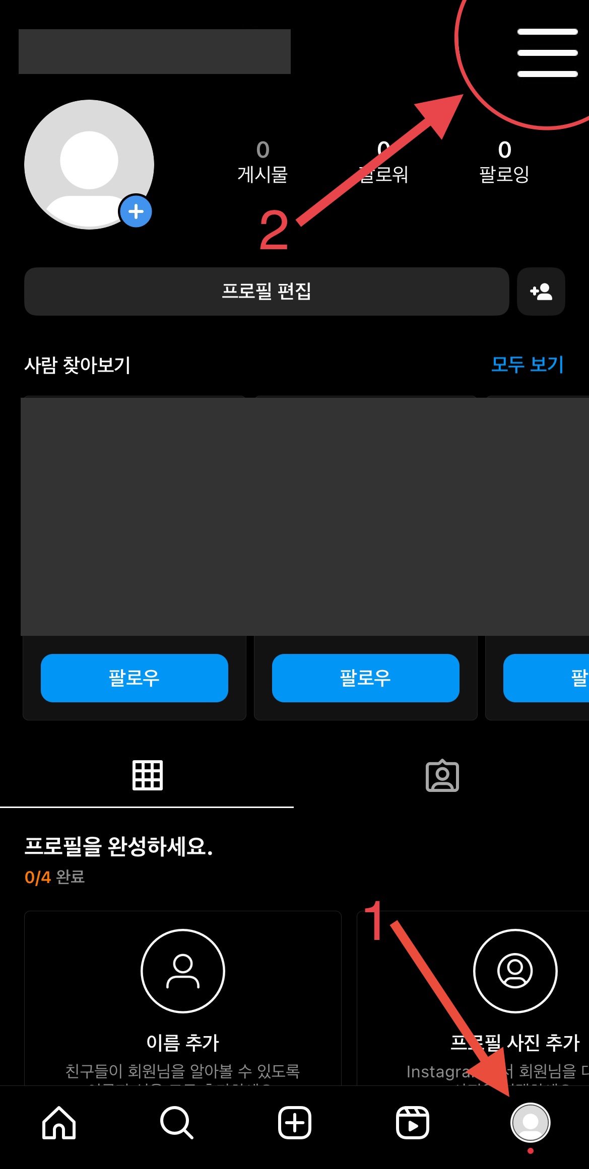 ▼ 먼저 인스타그램 1)하단 오른쪽에 있는 본인 계정을 누르고, 2) 오른쪽 상단의 선 세 개 메뉴를 누릅니다.