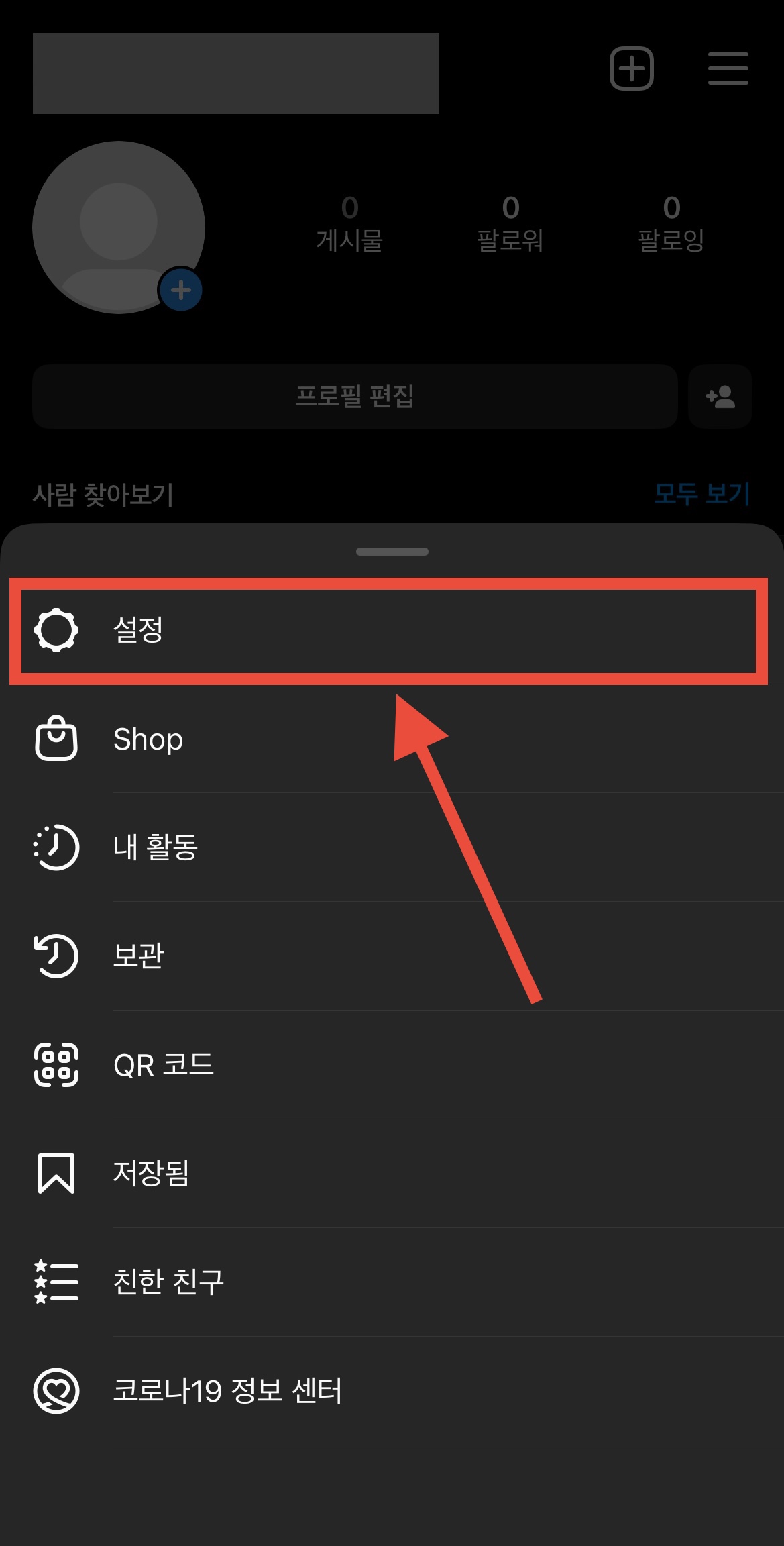▼ 먼저 인스타그램 1)하단 오른쪽에 있는 본인 계정을 누르고, 2) 오른쪽 상단의 선 세 개 메뉴를 누릅니다.