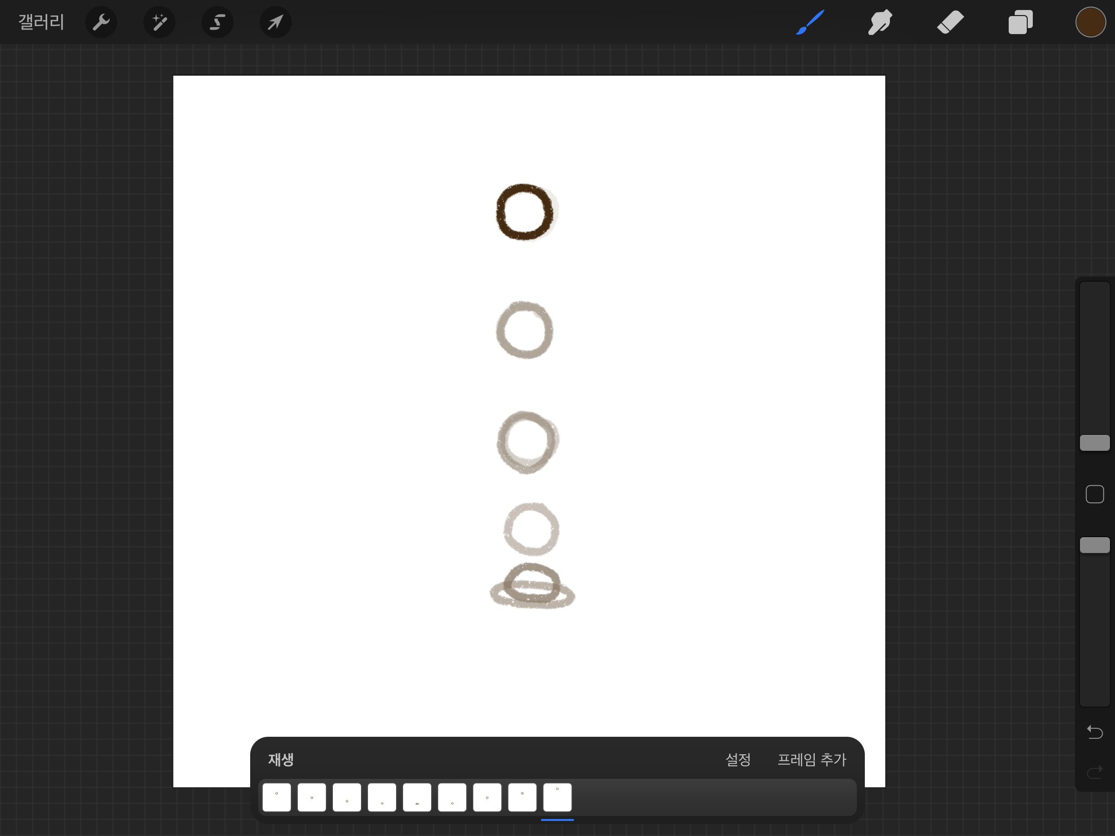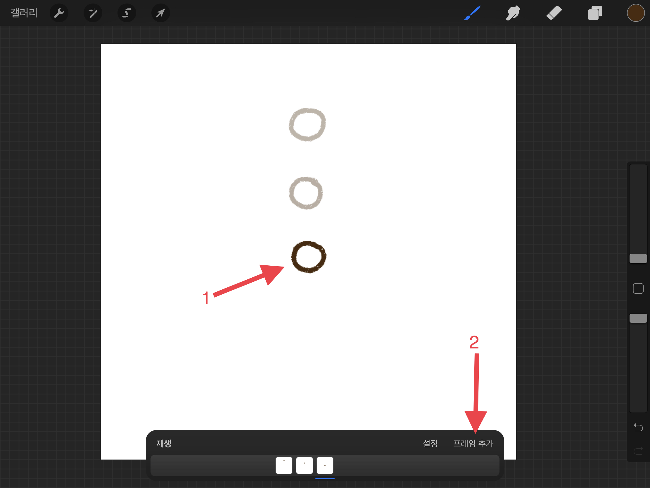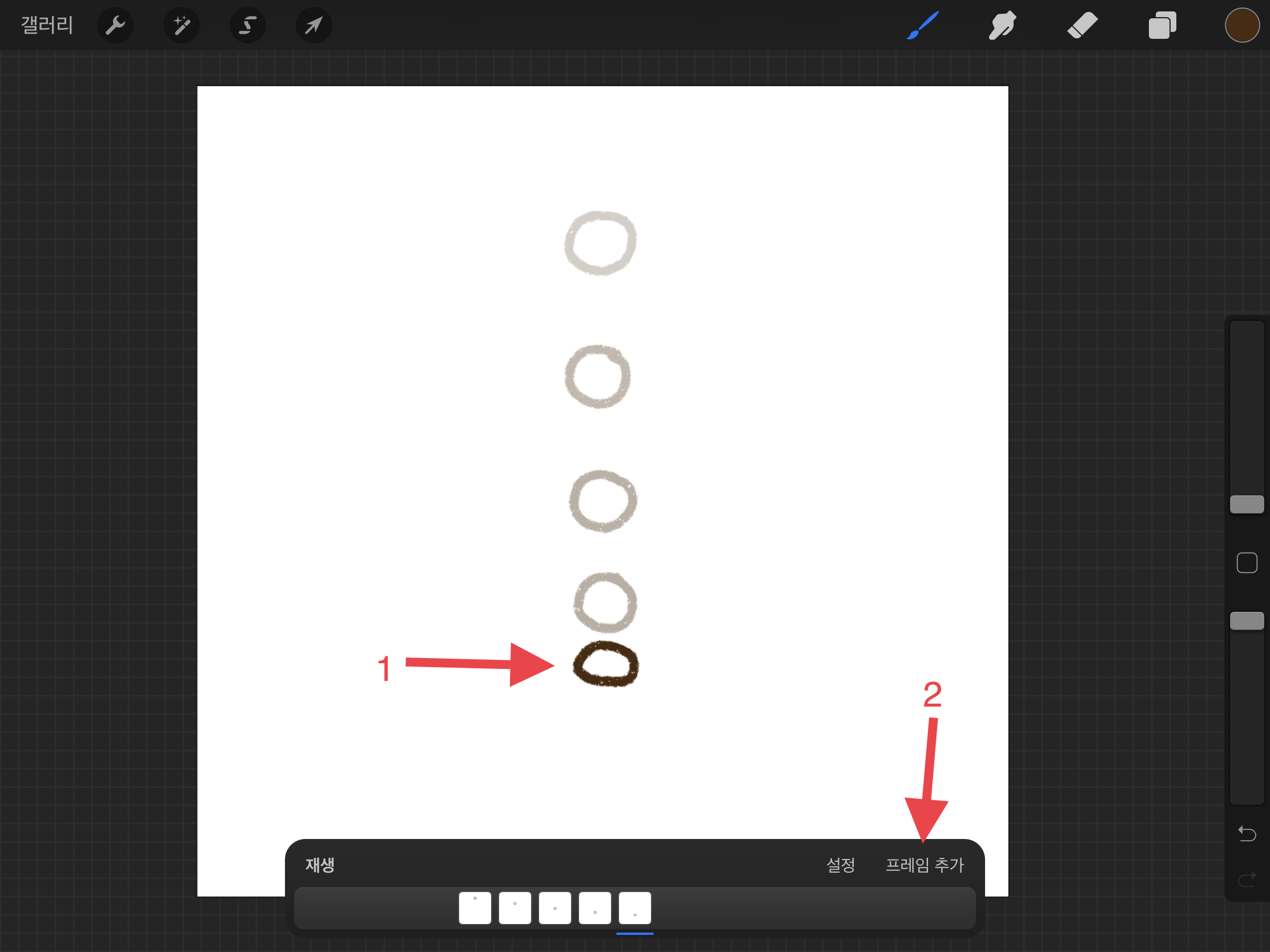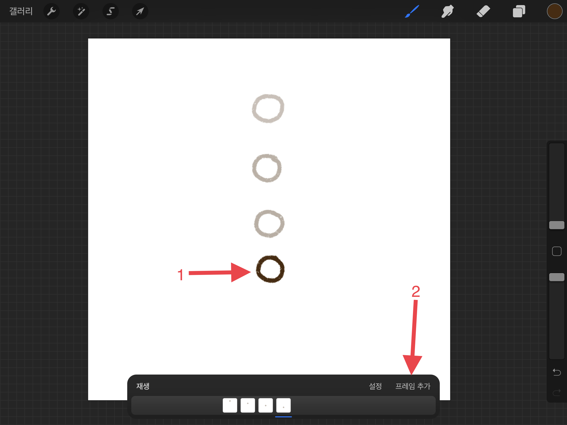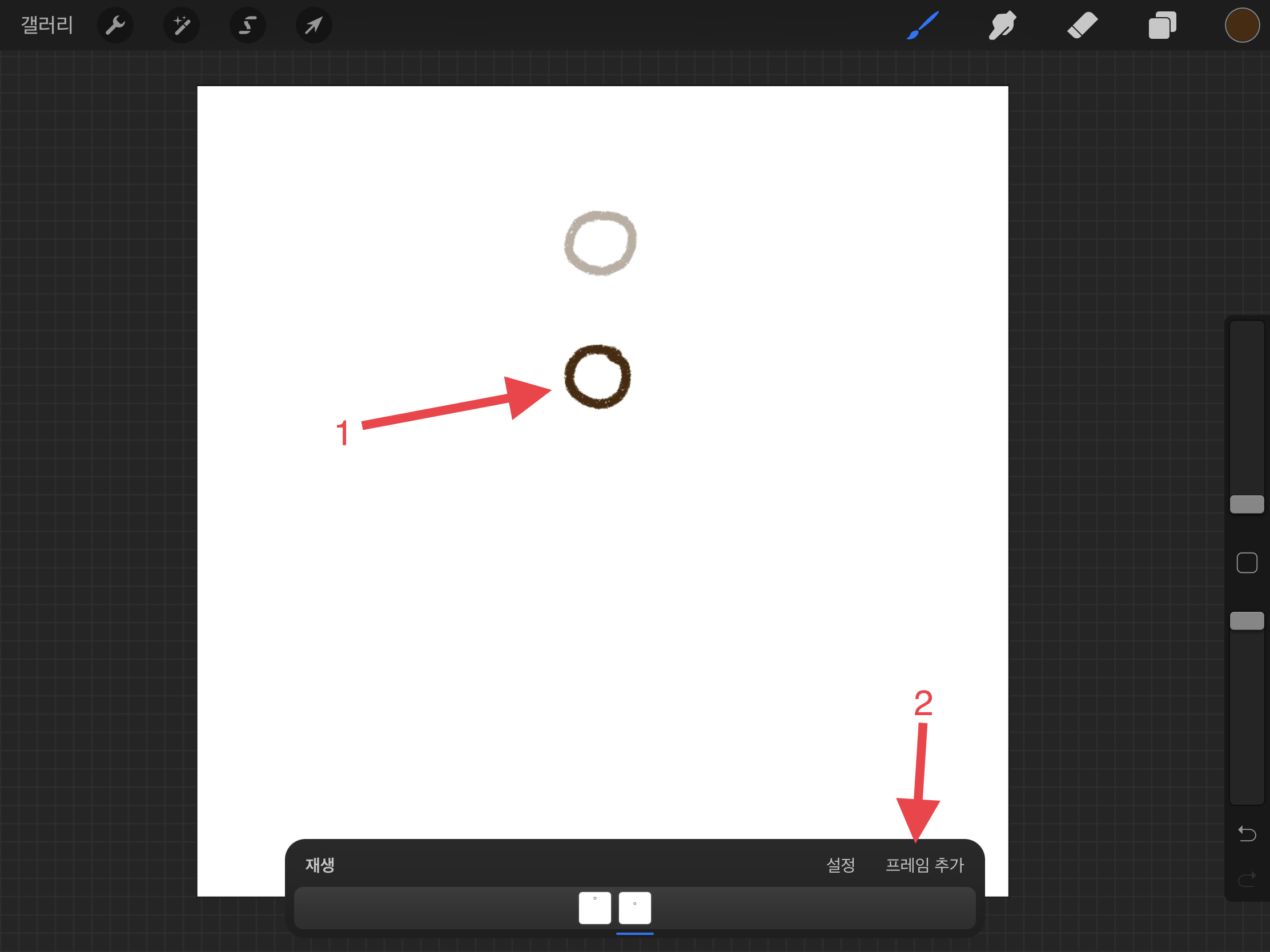 ▼ 동그라미가 떨어지는 움직임을 그리기 위해서 아래에 동그라미를 그려줍니다. 그리고 또 새로운 [프레임 추가]를 눌러주세요.