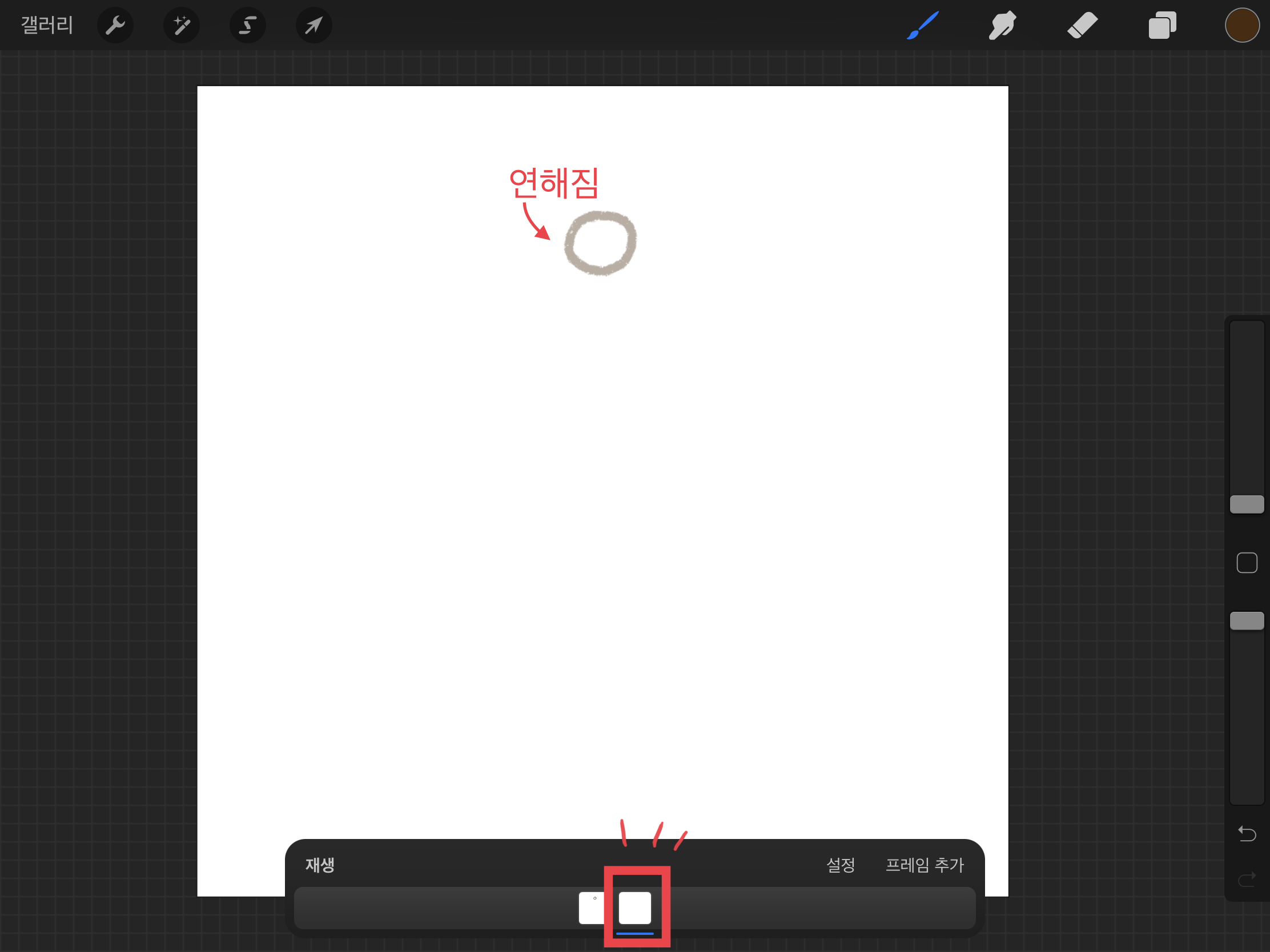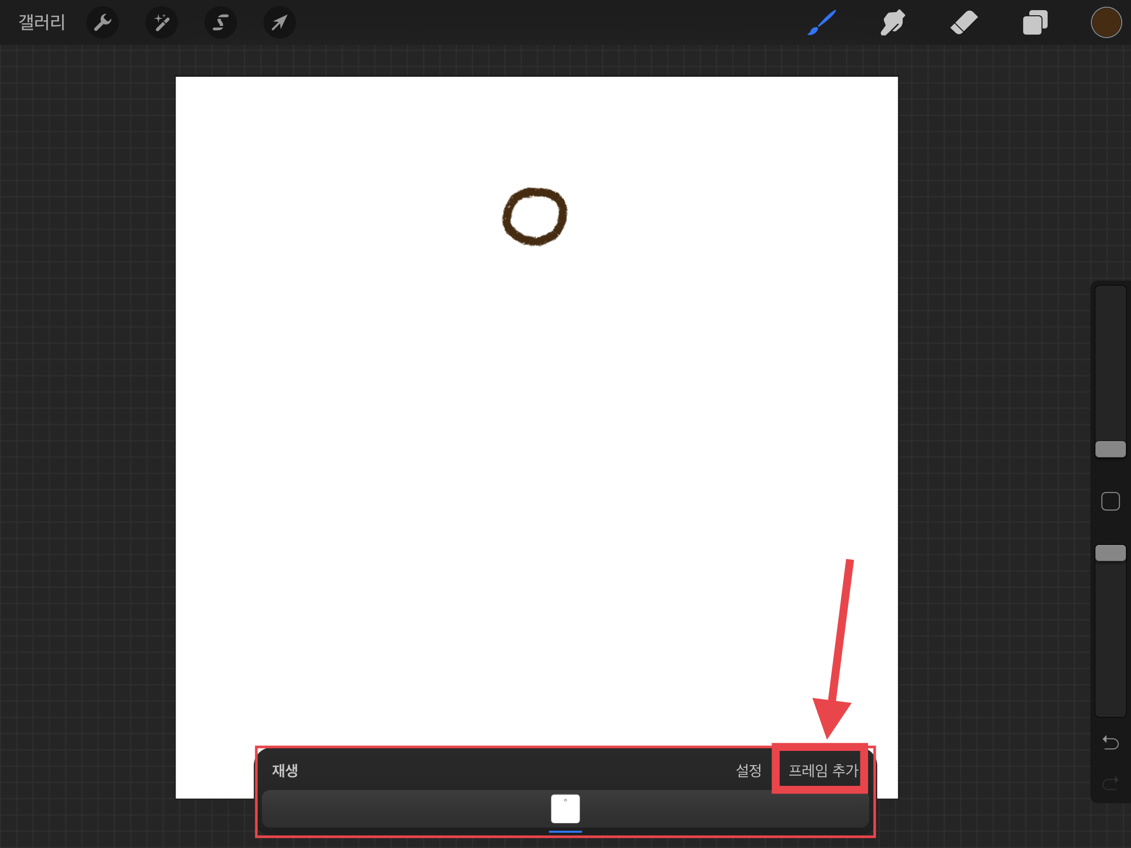 ▼ 아래 생긴 새로운 바(Bar) 오른쪽에 있는 [프레임 추가]를 해주세요. (새로운 프레임을 추가해야 다음 움직임을 그릴 수 있습니다.)