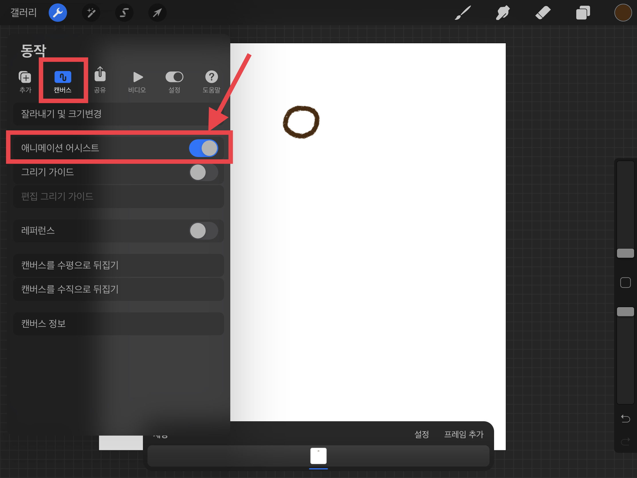 ▼ 그리고 두 번째에 있는 [캔버스] 메뉴를 선택한 뒤, [애니메이션 어시스트]를 활성화 해주세요.