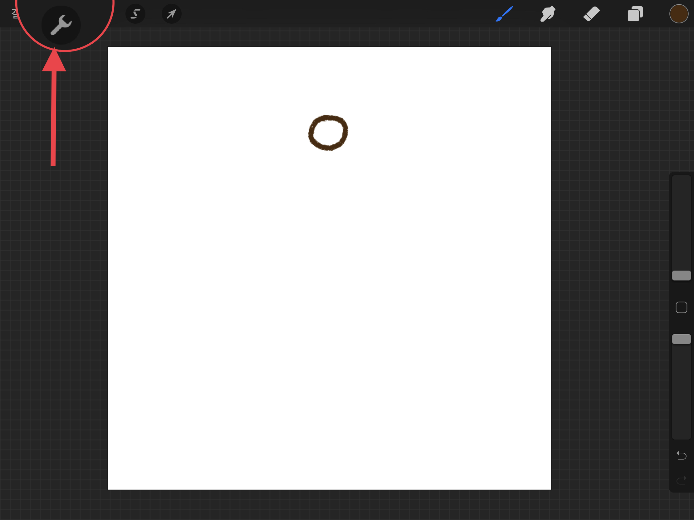▼ 먼저 레이어에 동그라미 하나를 그려 준 다음에, 왼쪽 상단에 스페너 모양의 [동작] 메뉴를 선택합니다.