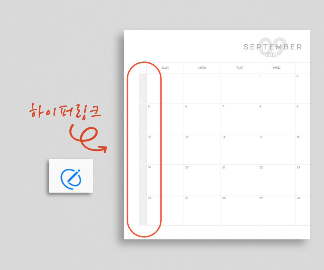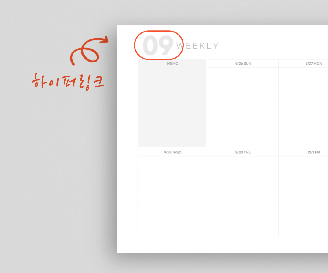 하이퍼링크는 먼슬리 부분 왼쪽에 있는 회색 바(Bar)에 되어있습니다. 오른쪽 상단에 있는 펜 버튼을 누르면 하이퍼링크 기능을 이용할 수 있습니다. 하이퍼링크가 활성화 된 상태에서 회색 바를 선택하면, 각 주(week)에 해당하는 위클리로 이동하게 됩니다.