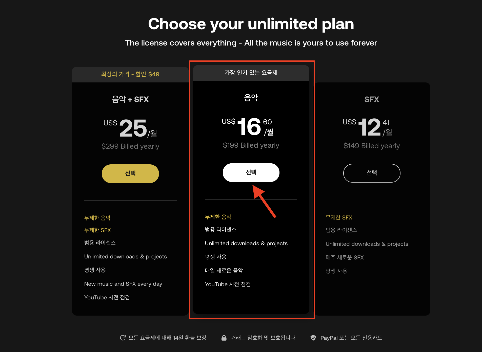 ◎ 음악 + 효과음 : 월 $23 이며 추천 코드를 이용할 경우 14개월에 $299 입니다.