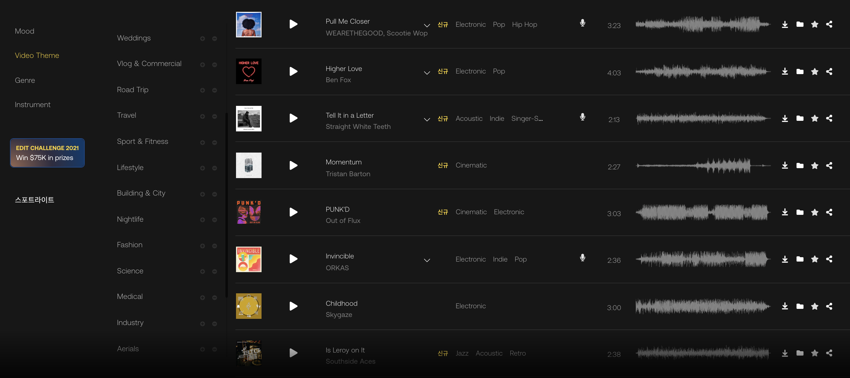 또한 브이로그와 싱어송라이터등 분위기와 상황에 맞는 카테고리가 잘 되어있어서, 음악을 찾기 편합니다.